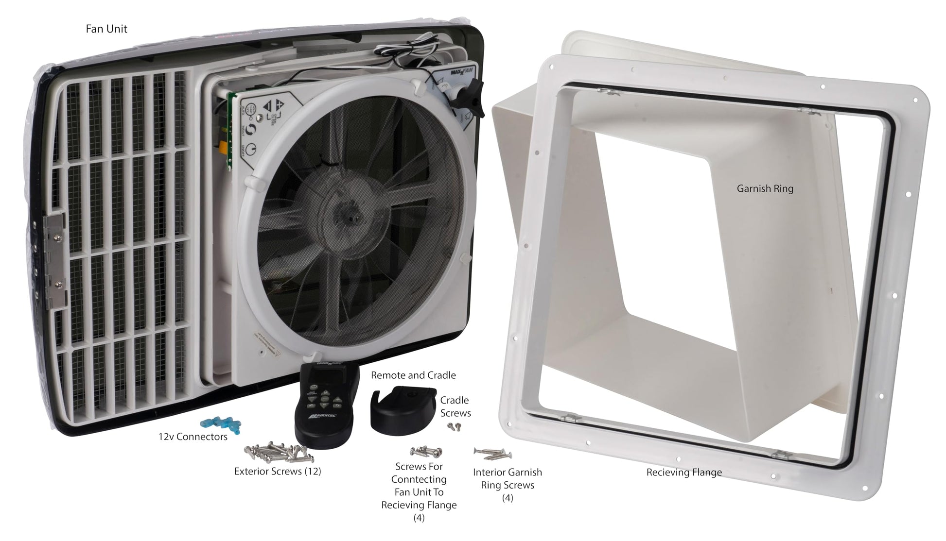 Details: The MaxxFan Deluxe is the only complete RV ventilation system that incorporates a vent, fan and rain shield in a single all in one unit. Twin lifting arms, no more lid fluttering in high winds or when driving. Features a powerful, fuse protected, Long life, sealed ball bearing, 12 volt fan motor and a 12' 10-blade fan. Flush mounted, easy to clean keypad controls fan speed, thermostat, air intake and/or exhaust functions. Fits all standard 14' x 14' roof openings, all mounting screws and hardware included. Roof sealant must be purchased separately. Brings in fresh air and removes hot musty air and odors.