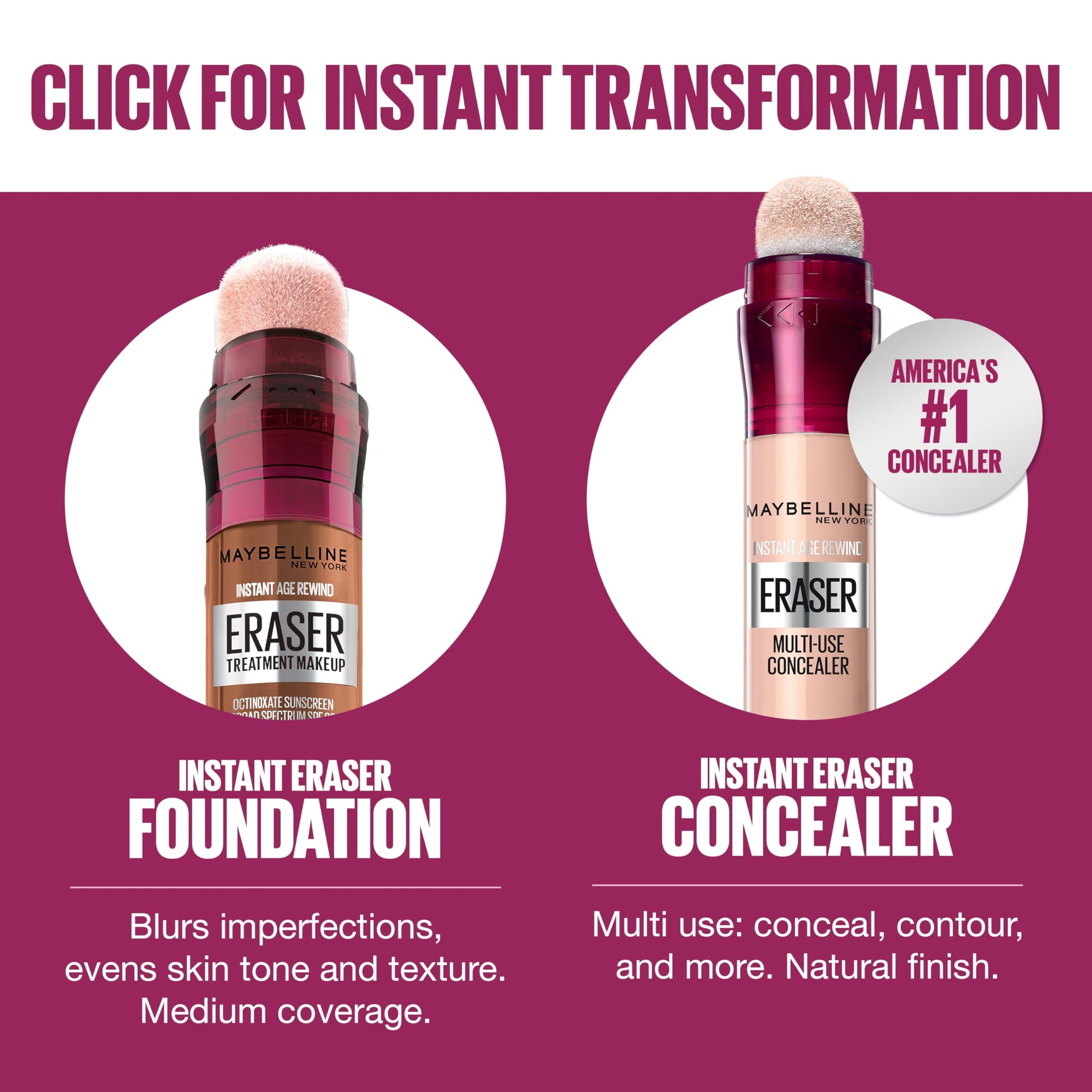 • Blur Signs Of Aging In An Instant: Click to instantly blur with Maybelline’s Instant Age Rewind Eraser Treatment Foundation. This moisturizing Maybelline foundation with SPF 20 covers uneven skin tone, fine lines and wrinkles for a natural look that lasts