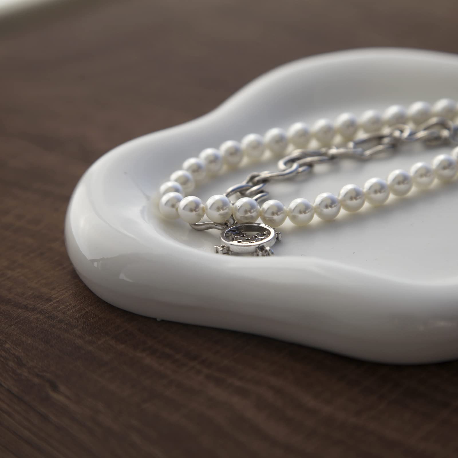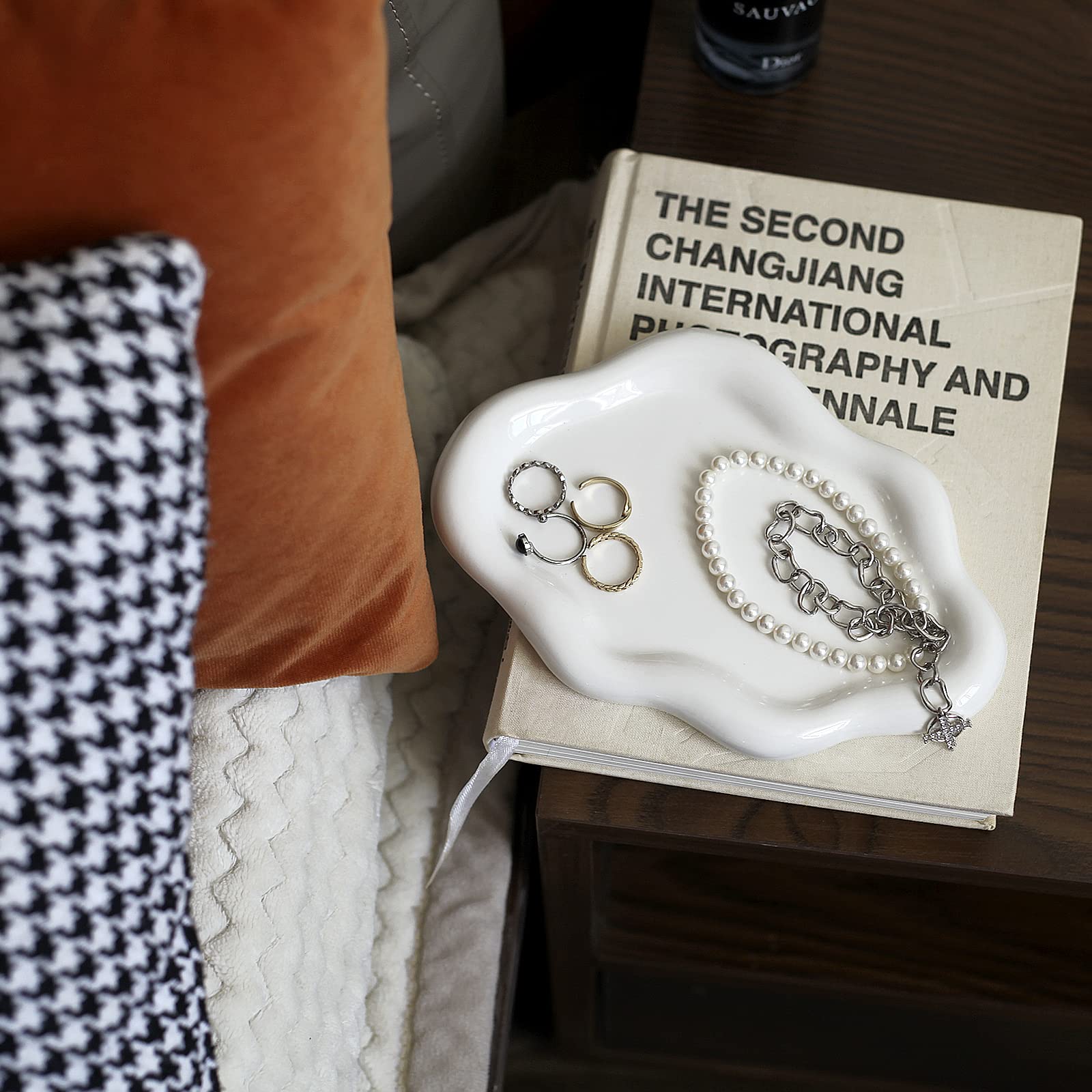 MDFAYE Jewelry Dish Trinket Tray for Women, Ring Dish Holder, Unique Cloud Shape Ceramic Plate Cute Things Vanity Aesthetic Room Decor Mother's Day Birthday (White)