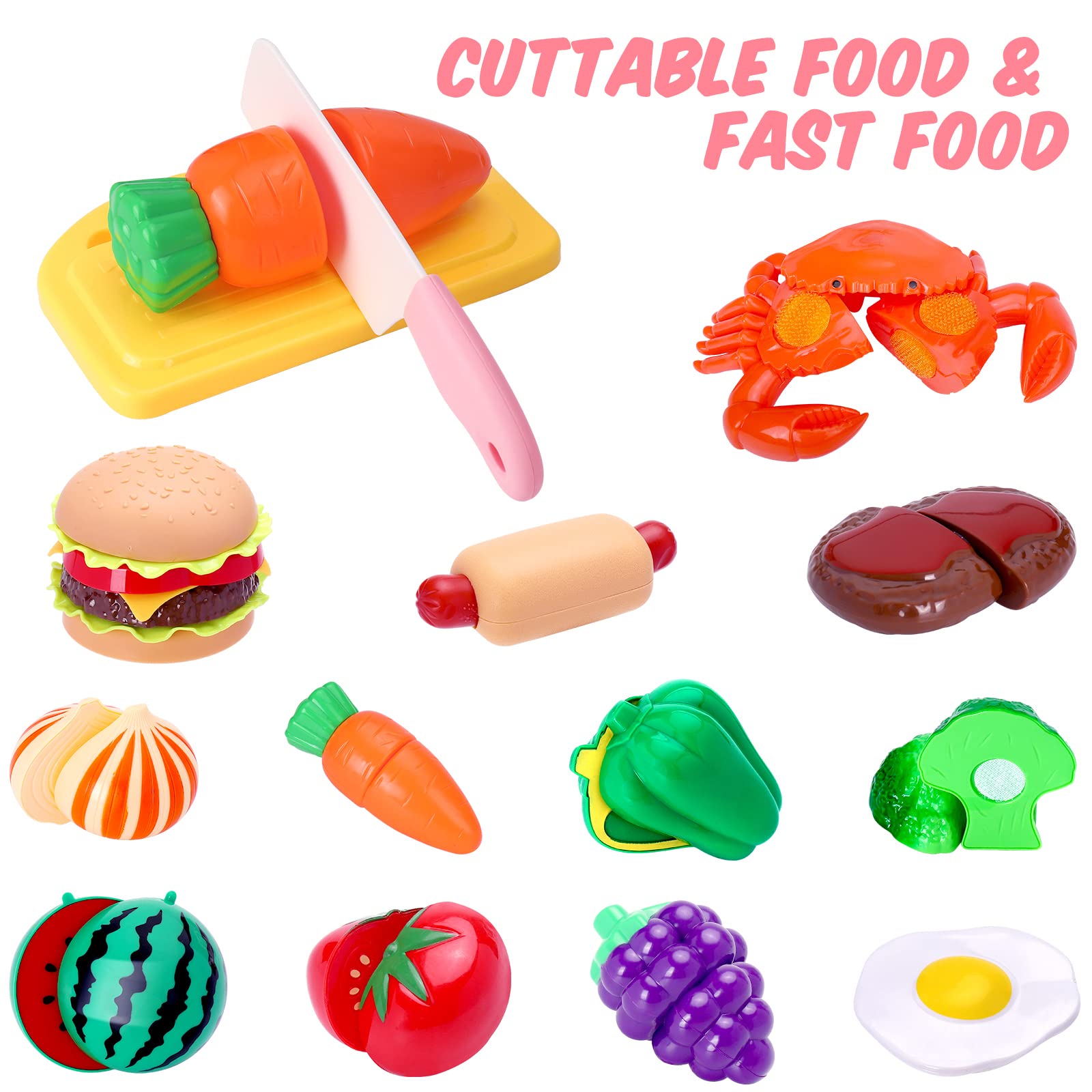 • Realistic Cutting Food Toys --- This play kitchen toys kit is in realistic design for kids to simulate cooking. The colorful velcro toy foods including cuttable fruits and vegetables, will make crispy chopping noise. The burger and hot dog can also be disassembled and combined. Children will improve their hands-on ability and cognitive ability for food and colors while having fun
