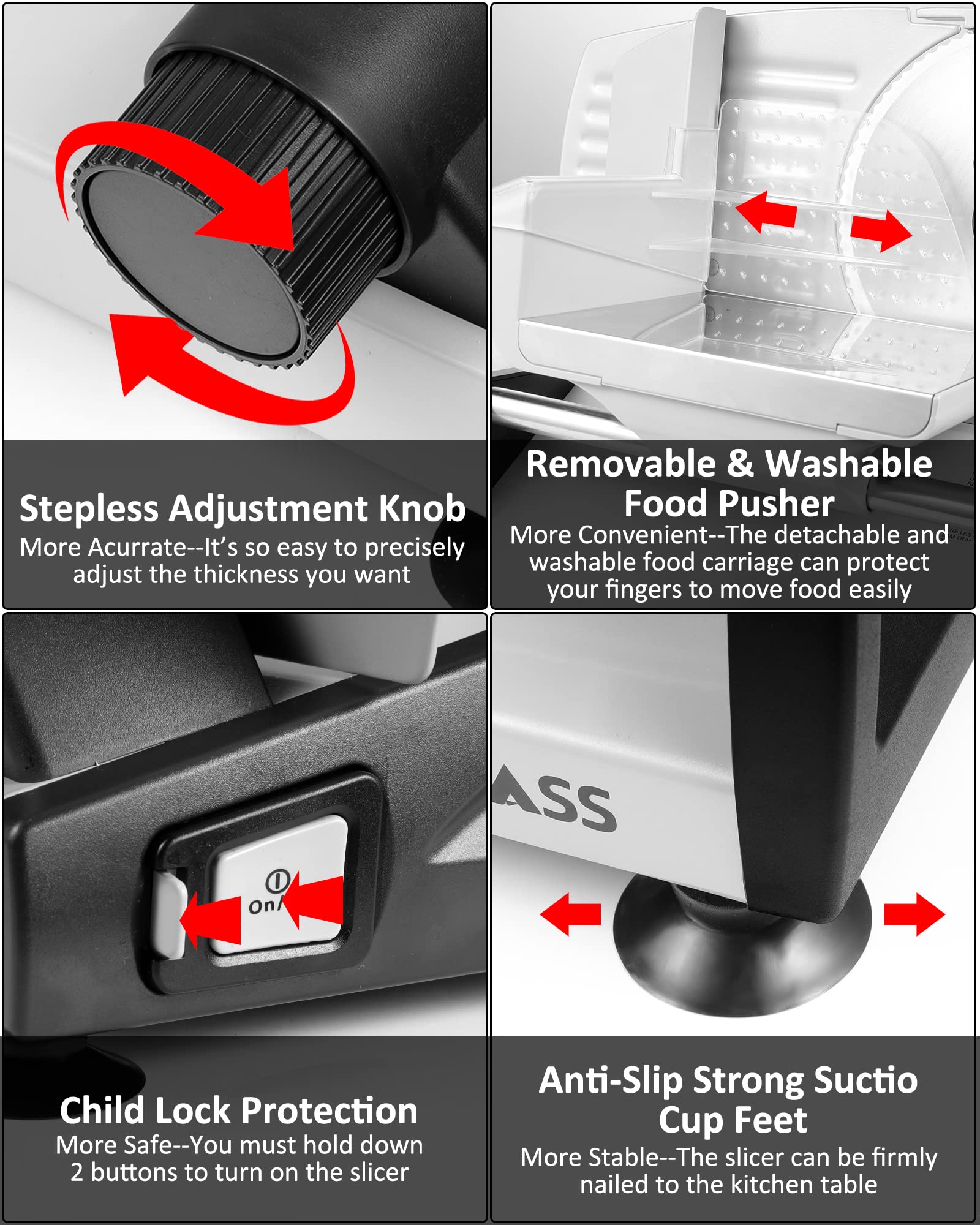 • [200W Powerful Power with Switch Child Lock] - 200W fast, high-yield slice power drive, you must press the safety lock and power button at the same time to start, to avoid misoperation and avoid accidental touch by children. Enough power and speed to cut almost anything. Not just raw meat, but cooked meat, cheese, bread and vegetables.