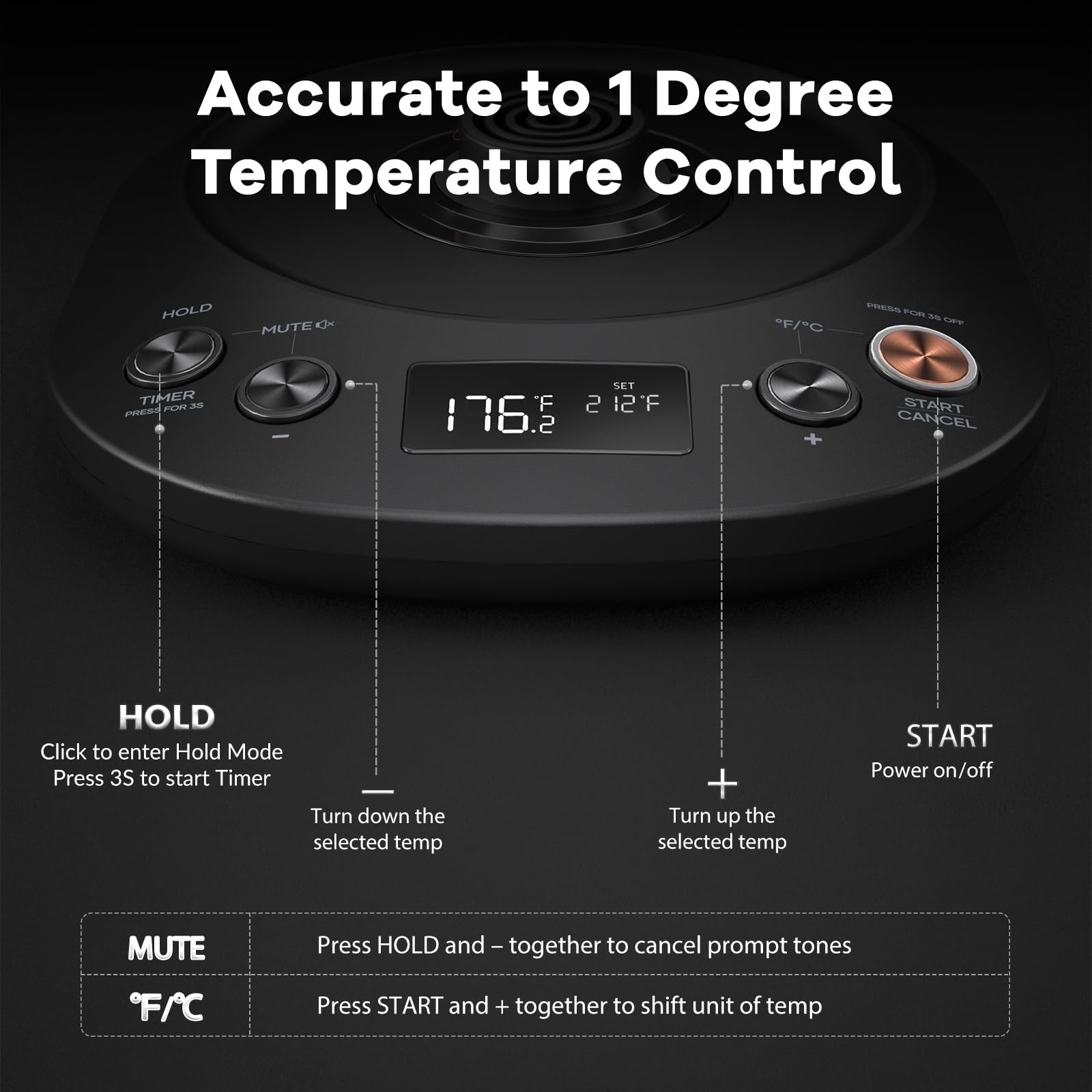 • Accurate Temperature Control and Realtime Display: Built in up-to-date advanced thermostat and 2.0 inch LCD display to show the realtime temperature and set temperature, and other information like hold time, mute mode, heating status, stopwatch. A single glimpse will give you all important parameters