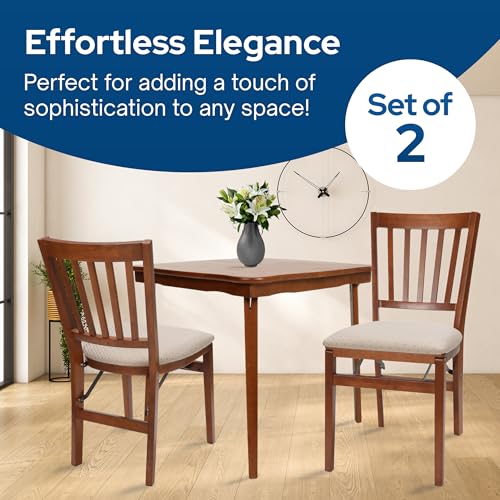 MECO Stakmore School House Wooden Folding Chairs with Padded Seats, Set of 2 - No Assembly Foldable Dining Chairs, Steel Folding Mechanism, Upholstered Cushion, Space-Saving, Fruitwood Frame