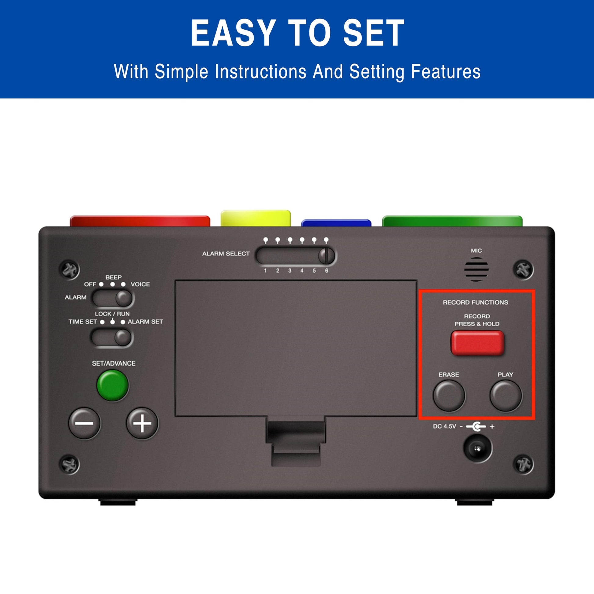 • TALKING ALARM CLOCK: Pre-record and playback up to 6 custom reminders throughout the day. Useful aid in remembering daily tasks like taking medications, that it's lunchtime or that a program you enjoy is ready to start. The custom recorded message allows for a familiar voice to alert the user of any task.