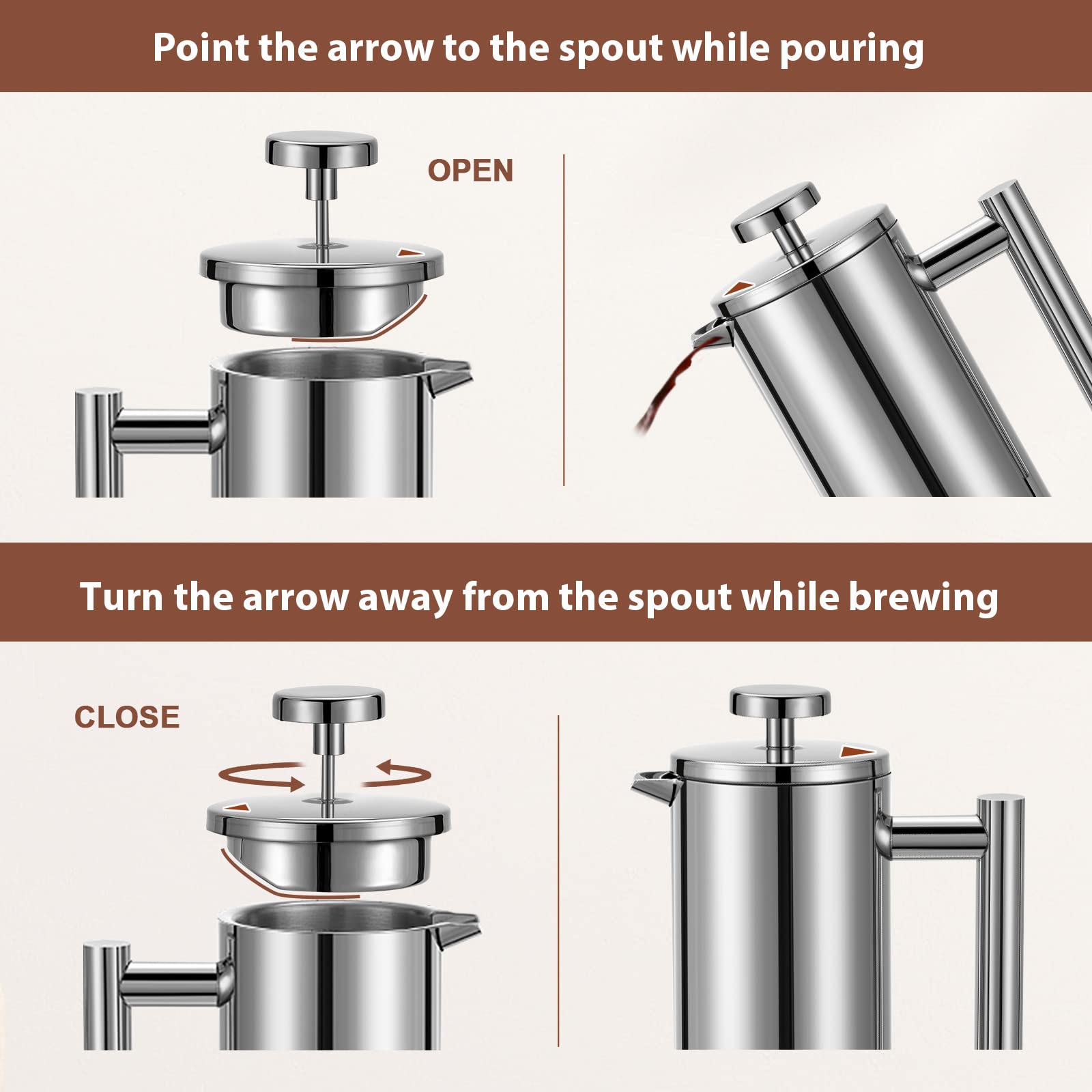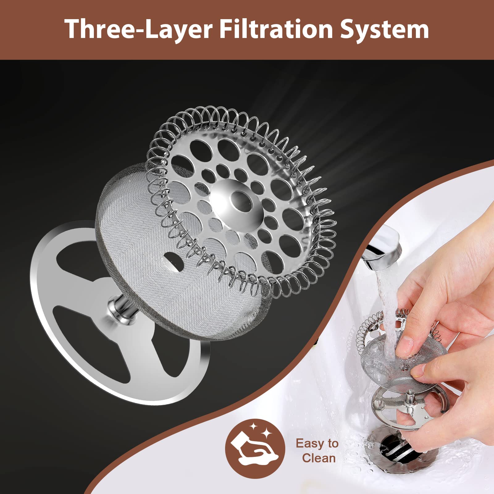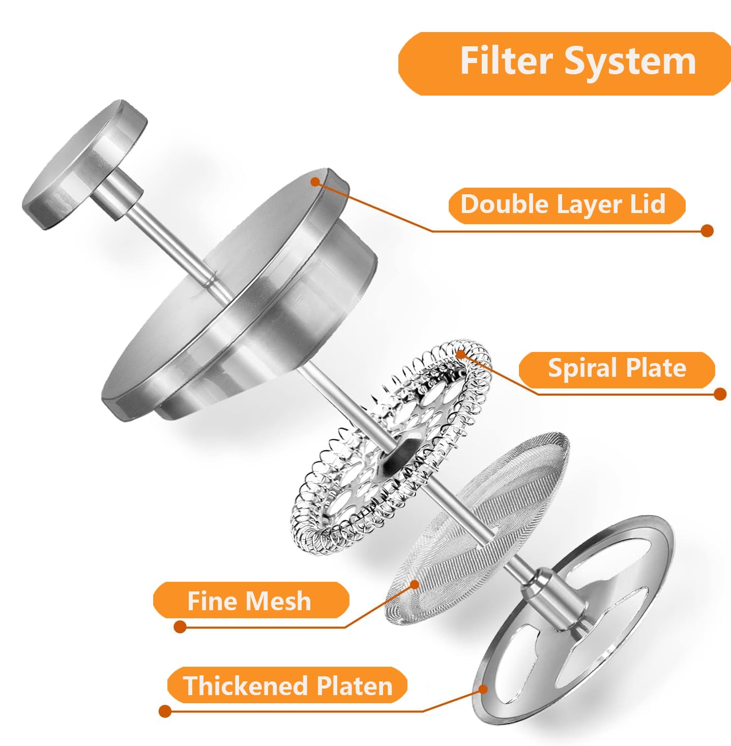 • Stainless Steel Filter : The Meelio large french press has a three-layer filter system, which can lock the natural oil and flavor of the coffee and filter out the coffee grounds. Two additional stainless steel filters are included, you can stack two or more filters to meet your own preferences.