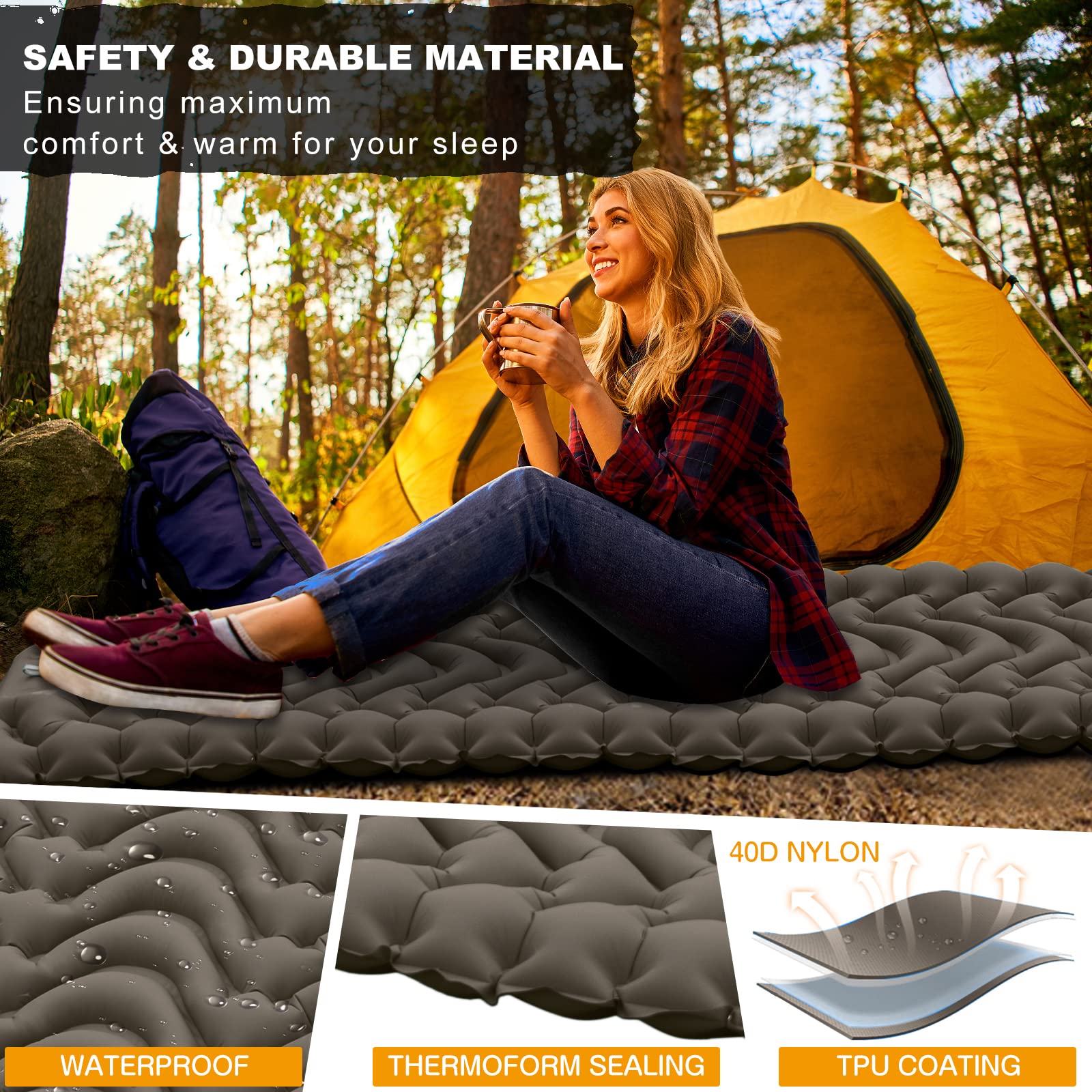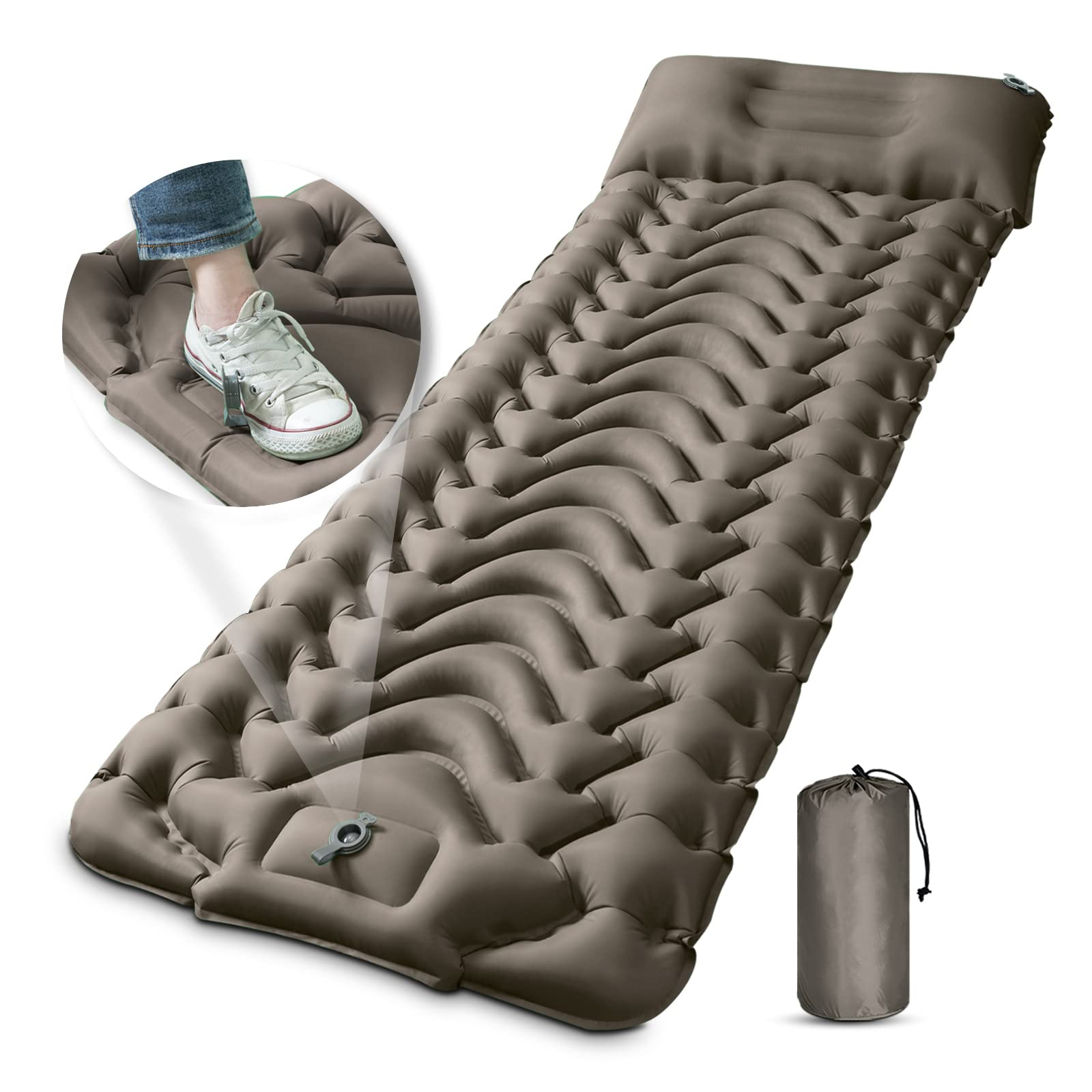 • 🐾【Only 30s Stomp to Inflate & 1s Deflate】- 2021 upgraded foot press sleeping pad, NO MORE inflating by your mouth, hands or carry a pump, just simply stomp on the built-in air pump at the bottom of the sleeping pad for only 30 seconds to inflate. Look, prefect camping mat, start your adventure. The newest single-layer air release valve design, just open the deflation plug, only need 1 sec achieve super quick to deflate.