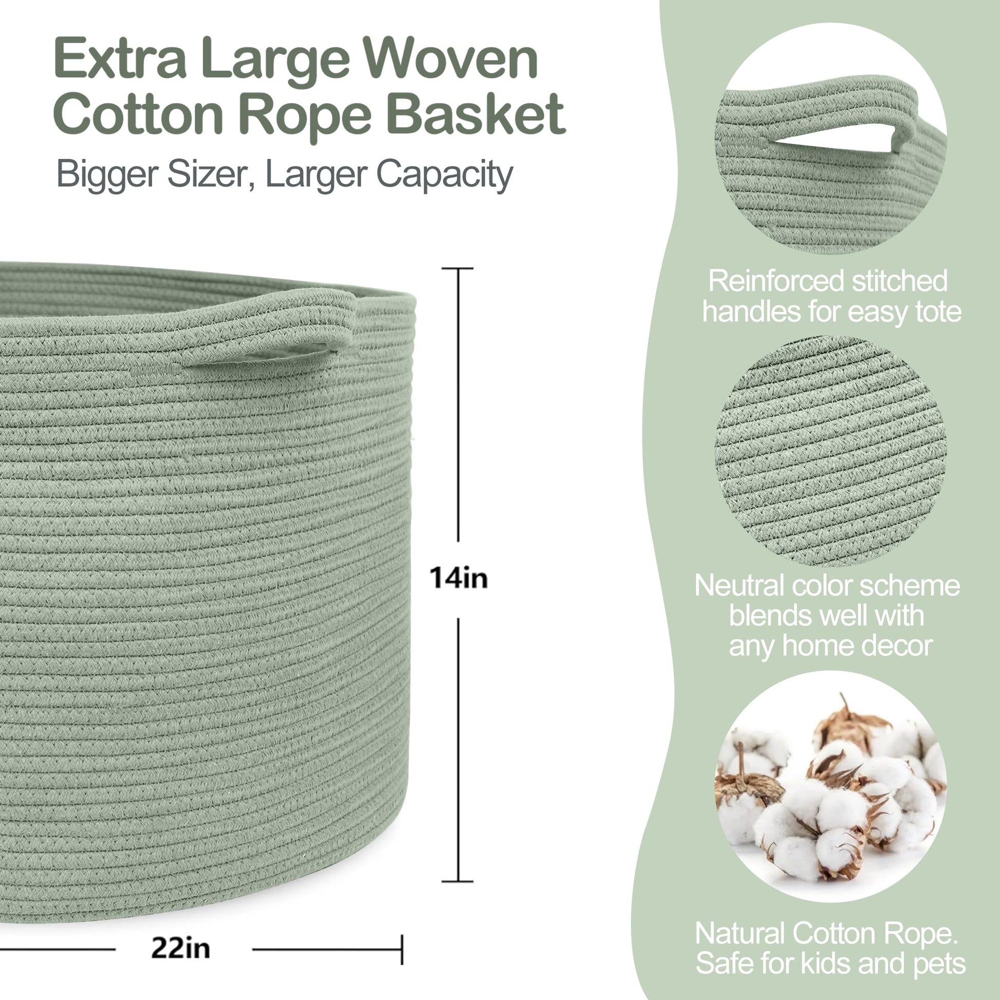 MEGASKET Extra Large Green Basket, 22" X 22" X 14" Woven Cotton Rope Baskets for Blankets, Nursery Wicker Laundry Basket, Kids Toy Storage Bin, Green Living Room Office Decor Baskets for Organizing