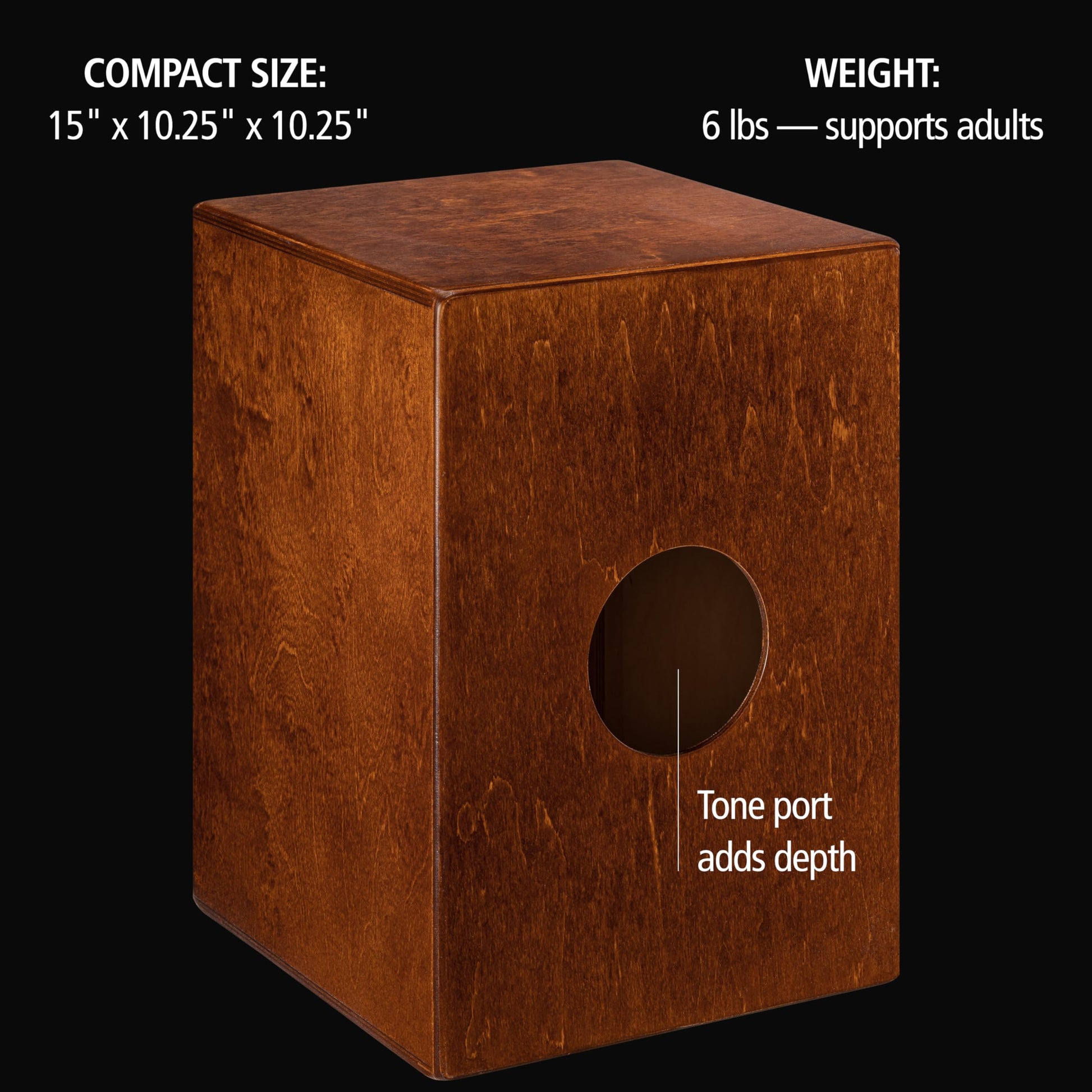Details: The Meinl Percussion Compact Jam Cajon is a portable, hand-played percussion instrument, made from 100% Baltic birch for full bass and crisp slap tones. Baltic birch delivers naturally balanced sound with punchy lows and clear highs (it’s used in high-end drum sets for serious players). Two sets of fixed steel snares add crisp tone, while a rear sound port enhances bass and serves as a mic spot. Non-slip silicone feet ensure stability and maximum resonance on any surface. Compact and travel-friendly, it's perfect for jam sessions and easy for anyone to play, regardless of age—no experience required. 10.25' W x 15' H x 10.25' D, 6 lbs. (holds adults). Made in Europe.