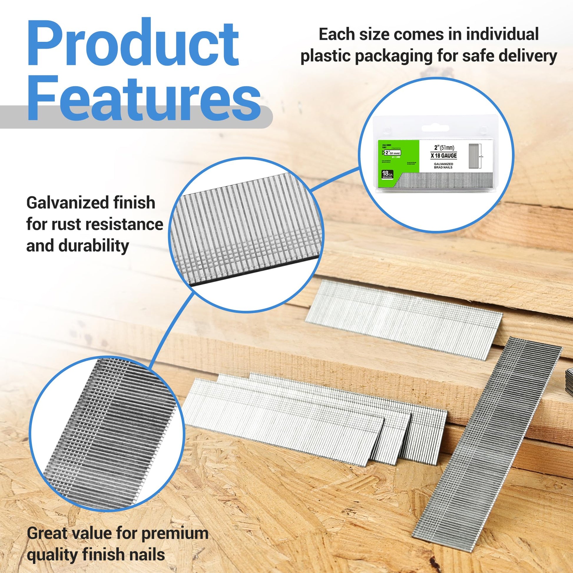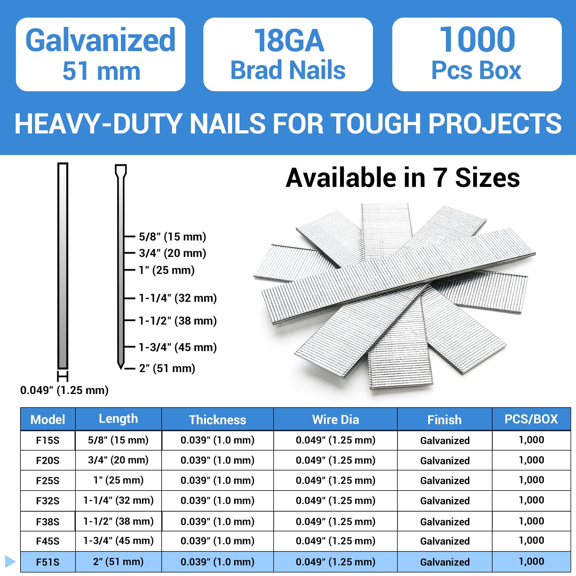 • [Size] 18 gauge 2-inch (50 mm) in length galvanized brad nails; [Quantity] 1,000 PCS per Small Pack