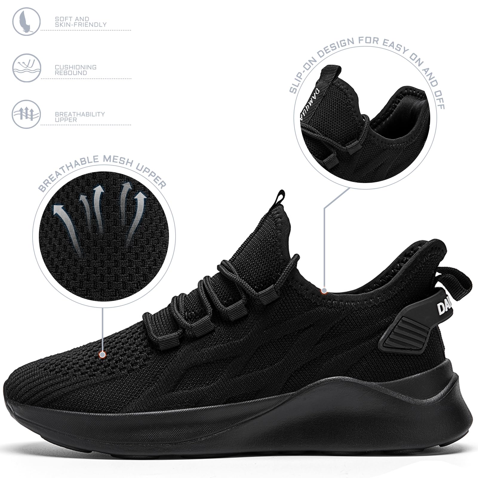 Mens Running Shoes Tennis Sneakers Walking Slip on Gym Black Workout Athletic Breathable Jogging Sport Casual Shoe Size 8.5