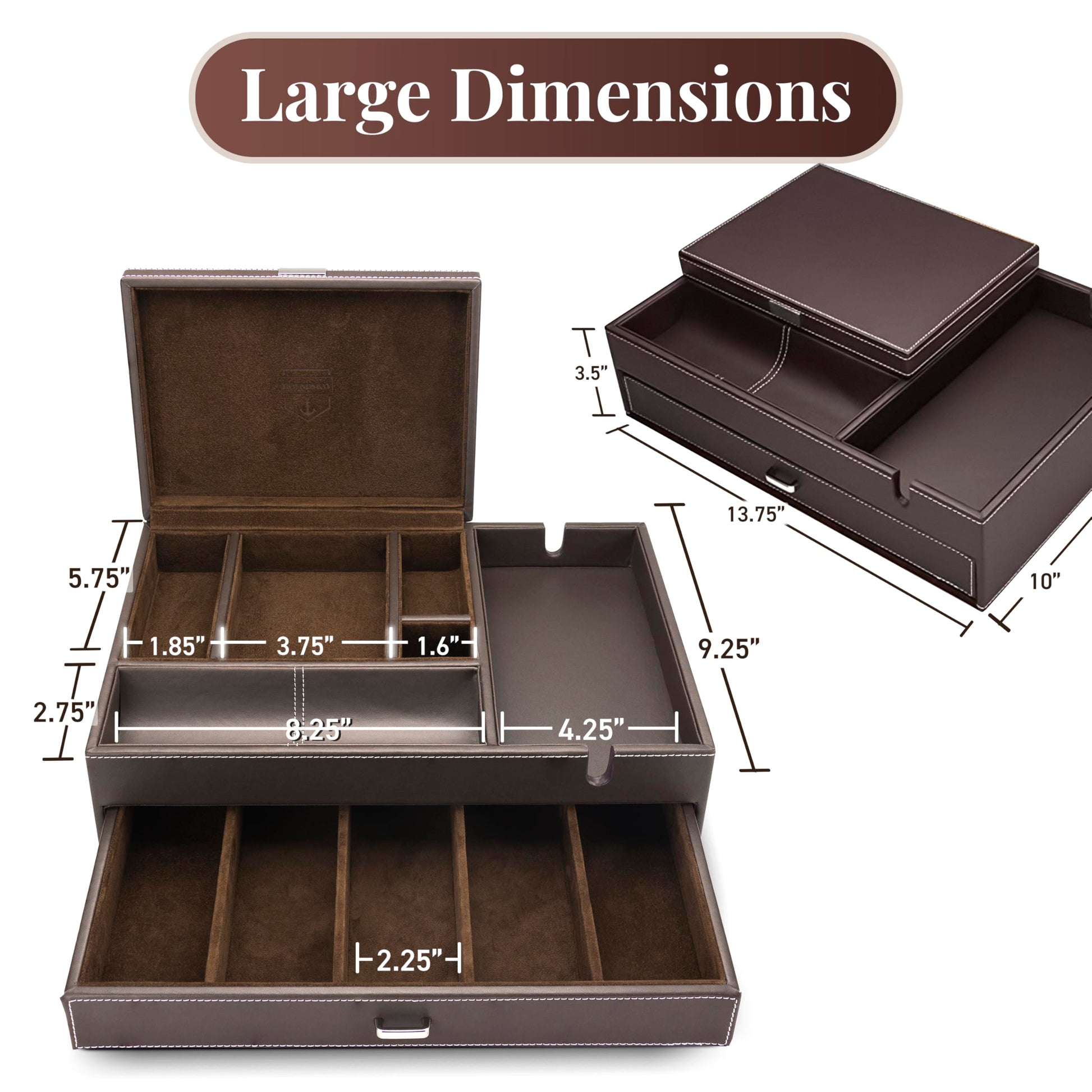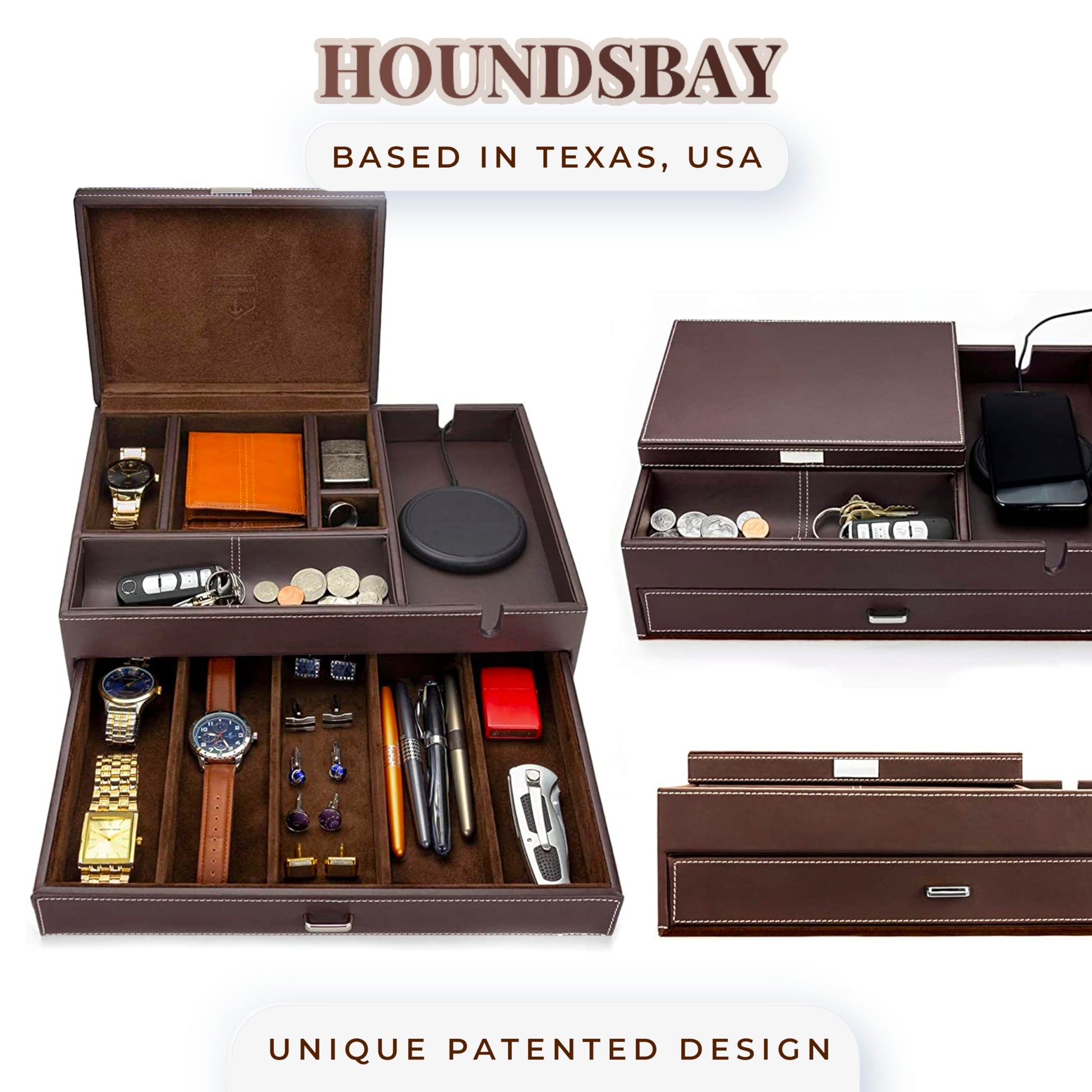 • The Admiral is the ultimate dresser valet box for any nighstand or dresser - Patented by HOUNDSBAY, this jewelry box organizer combines an oversize charging station, catchall tray, compartment lid, and accessory watch case all in one.