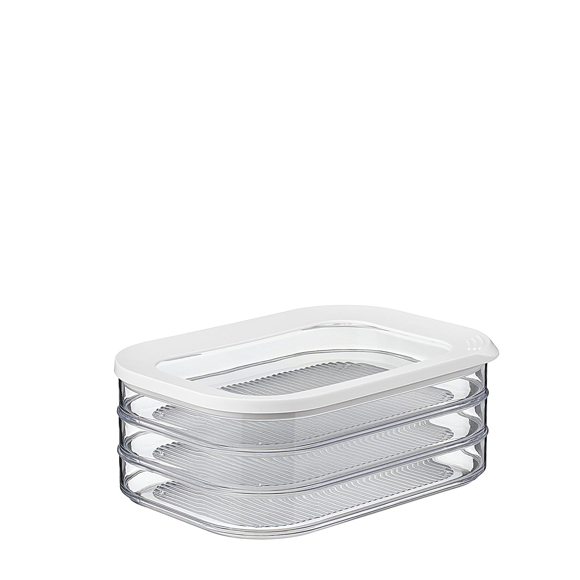 Details: The Mepal cold meat storage container Modula 550/3 is suitable for storing different meat products in one box. The kitchen storage container consists of 3 different compartments that are stackable. So, you can store meat slices of sausage, chicken, bacon and salami separately in the fridge organiser. The container for food features a sealing ring which ensures perfect seal, making this kitchen organizer suitable for storing various meat products. The rectangular Modula meat boxes with rounded corners have a capacity of 1650 ml. In addition, the ham holders & bacon containers from Mepal are transparent and have a clear lid. This gives instant visibility of contents, even in the fridge. It is good to know that the Modula containers of Mepal are available in different sizes and colors. Also, like all Mepal storage boxes, the Modula meat cuts container is food-safe, 100% BPA-free, stackable and dishwasher-safe. No matter how demanding you are: Modula storage boxes are up to it!