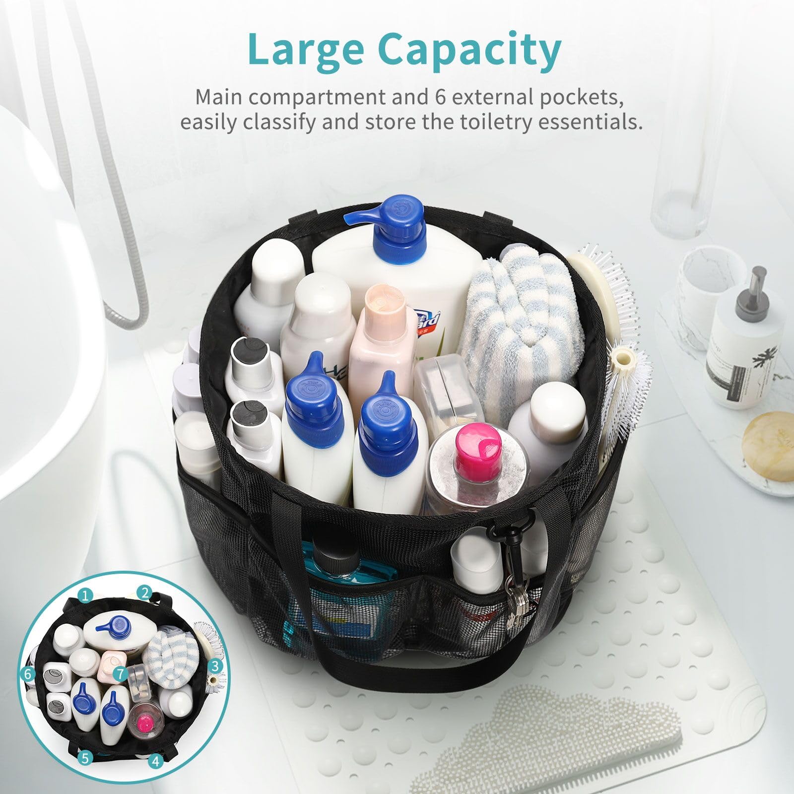 • Large Capacity: 9.45 x 8.27 x 9.65 inch, a large main compartment and 6 side pockets, which can store all dormitory stuff and bathroom shower essentials, such as full-size shampoo bottles, conditioner, hairspray, body wash, shaver, toothbrush, comb, towel, hairdryer,ect, and keeps them organized.