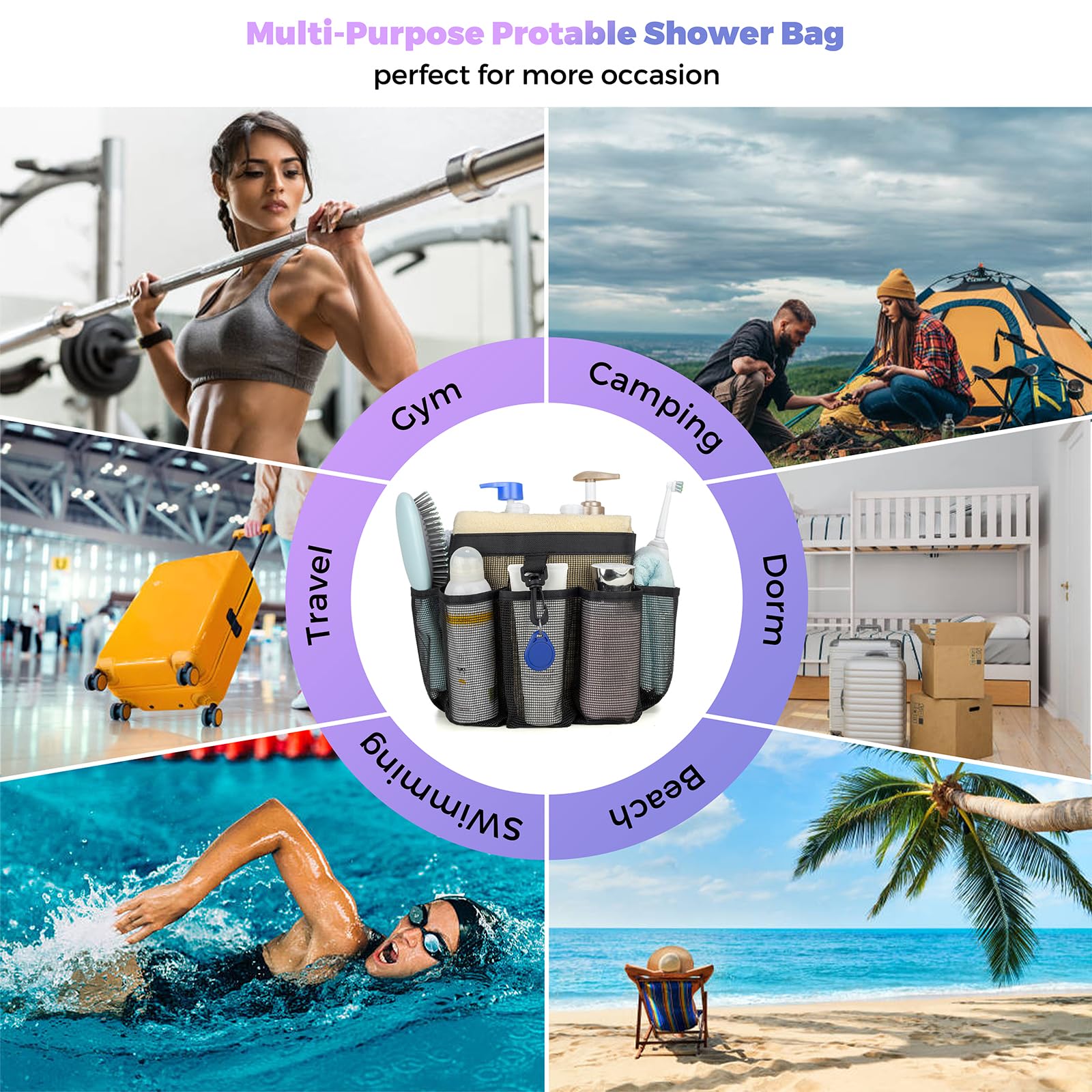 • Larger Capacity with 8 Pockets:The shower tote bag has 8 outer compartments,Side pockets serve to hold the toiletries like suncream, face cleanser, and other tiny pieces like sunglasses, shaver, comb, and more. In contrast, the main pocket offers ample space for shampoo, body wash, towel, clothes, hairdryer, etc.
