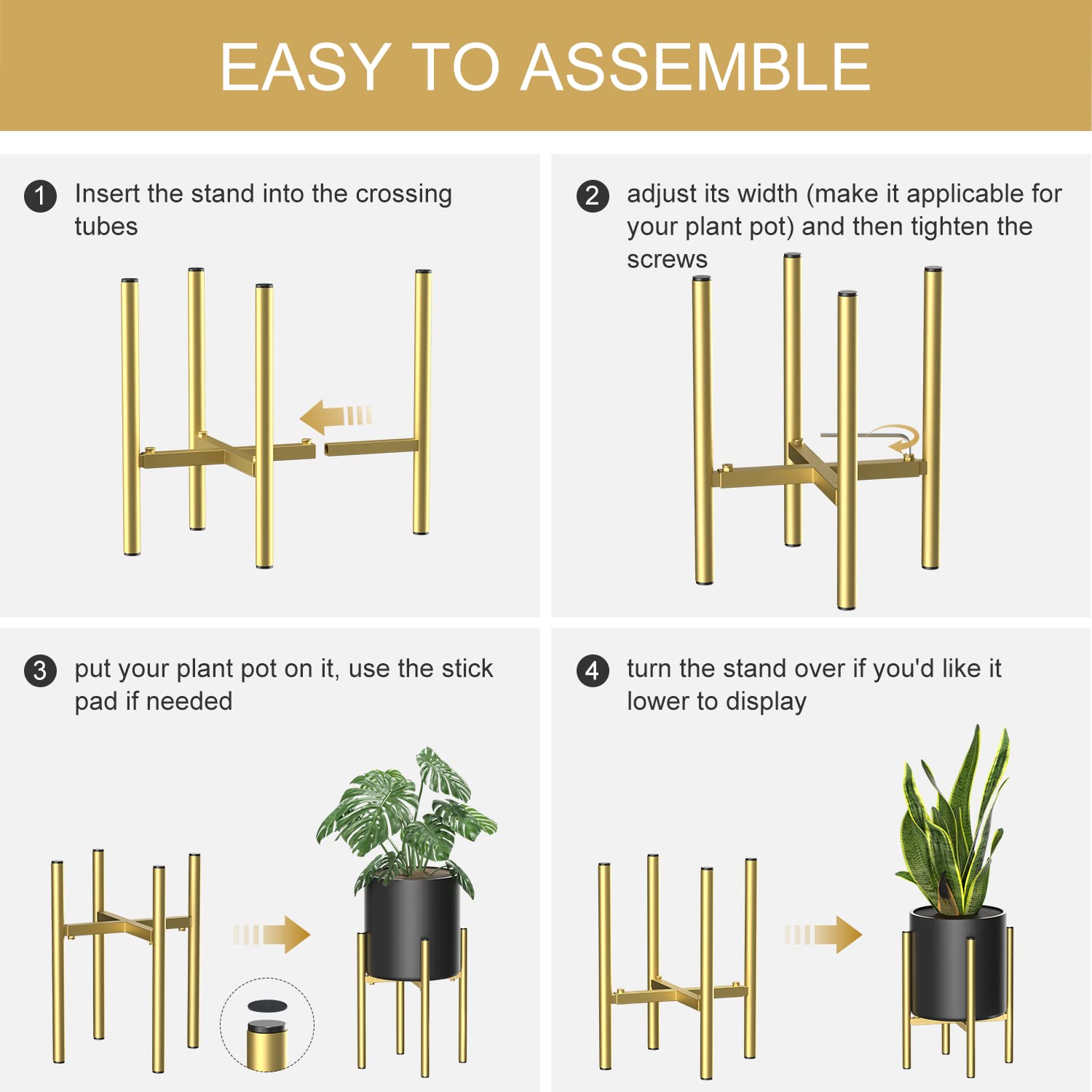 • FAST & EASY ASSEMBLY: Simply insert the stand into the crossing tubes, adjust its width (make it applicable for your plant pot) and then tighten the screws. You may move the stand or stick the foot pads till it’s balanced. And now put your plant pot on it and get ready to enjoy the gorgeous plant display.