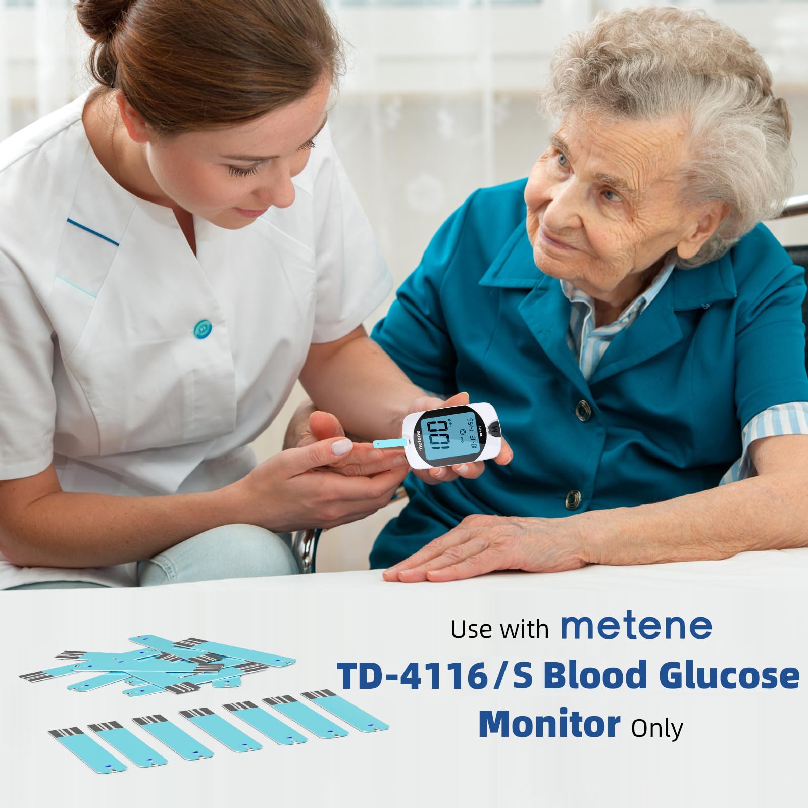 • Metene TD-4116 Test Strips: These test strips are for use with metene TD-4116 and metene S blood glucose monitor only; Not compatible with other blood glucose monitor; Close the vial immediately after taking out a test strips