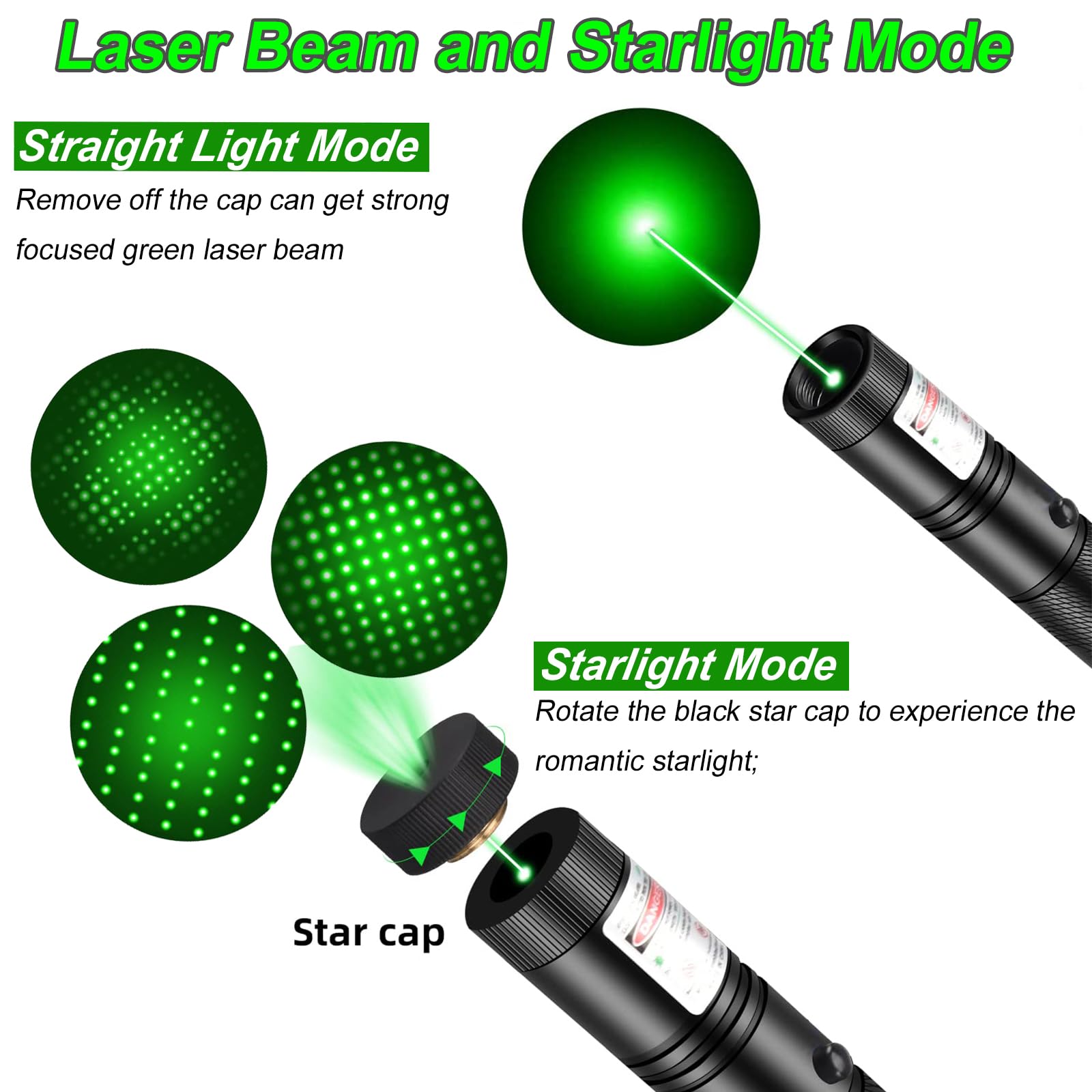 🔦 GreenLaser Pointer High Power : Rotate to take laser pointer star cap off, experience the long range green laser beam. You can see the Green laser beam trajectory is clearly whether it is day or night, long range laser irradiation can reach 10,000 feet at night.