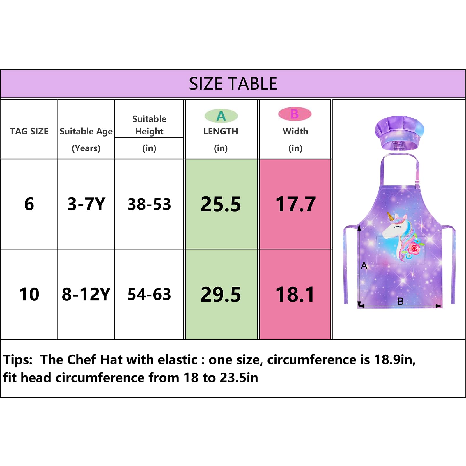 • Child Aprons Sizes: 2 Sizes available: Small:25.5" X 17.7" (suggest for age 3-7 years); Large:29.5" X 18.1" (suggest for age 8-12 years); One size chef hat with elastic on back,comfortable to wear