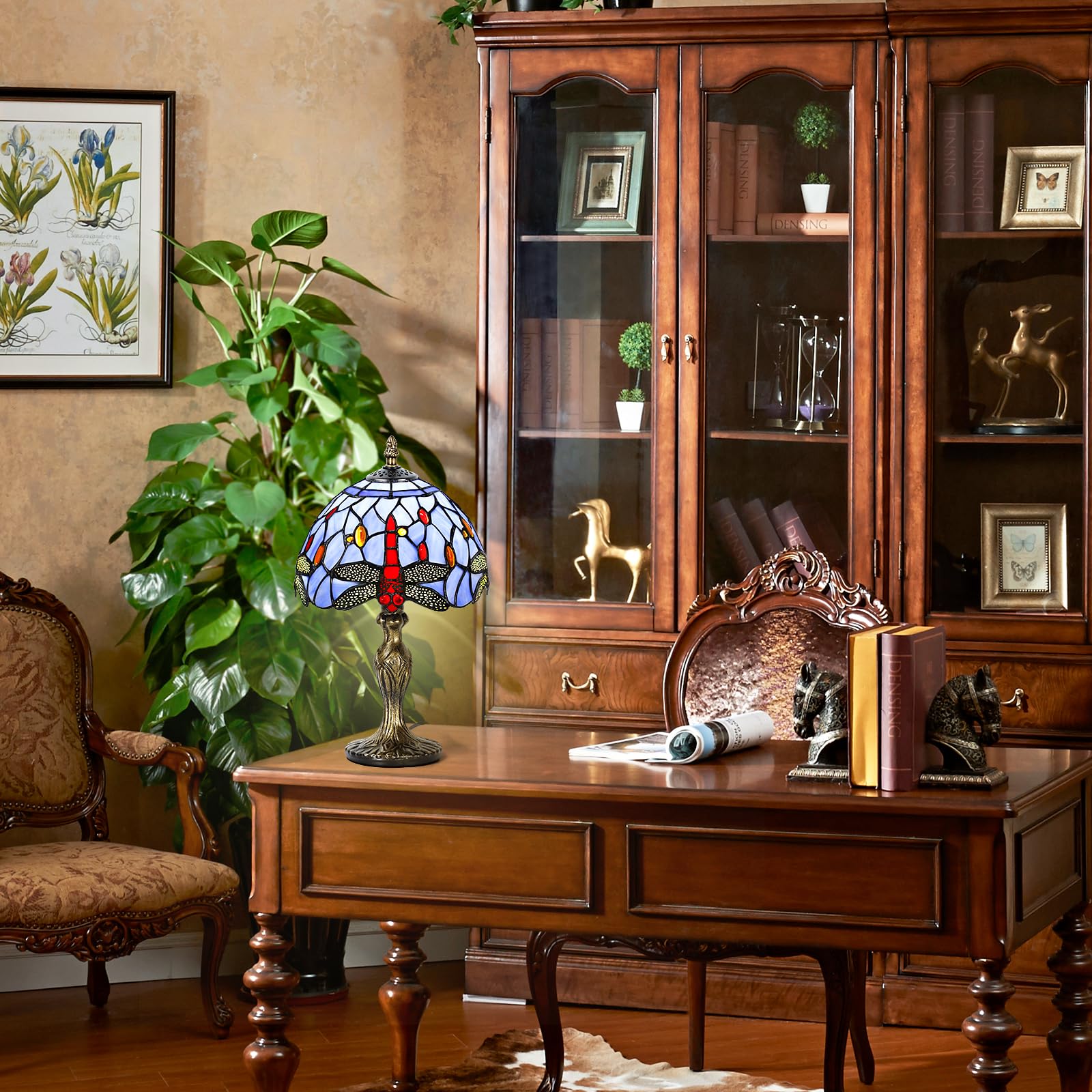 MIAOKE Stained Glass Table Lamp,Stained Glass Crystal Bead Style Table Light, Handmade Desk Bedside Night Light, Antique Art Craft Gifts Lover Living Room Bedroom Bookcase(Blue Dragonfly)