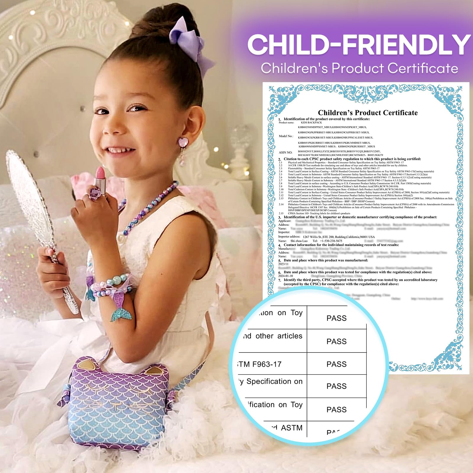 • Dress up Girl Toys Jewelry: This girls purse come with 1 pair of clip-on earrings, 1 heart-shaped ring, 1 bow-knot hair clip, and a set of matching colorful mermaid beaded necklace and bracelet.Princess dress up for girls 4-6, Girls toys age 4-5, 6-8.