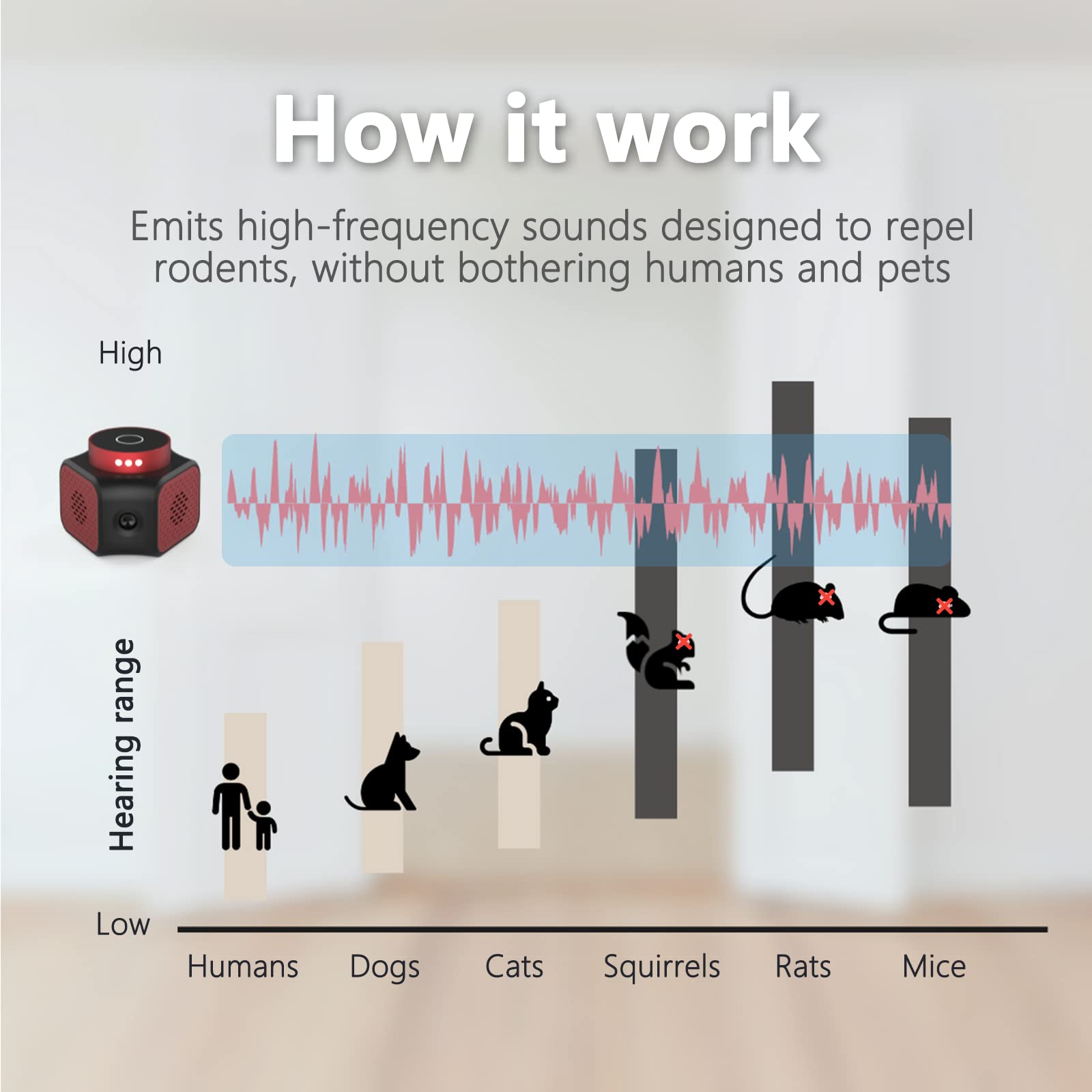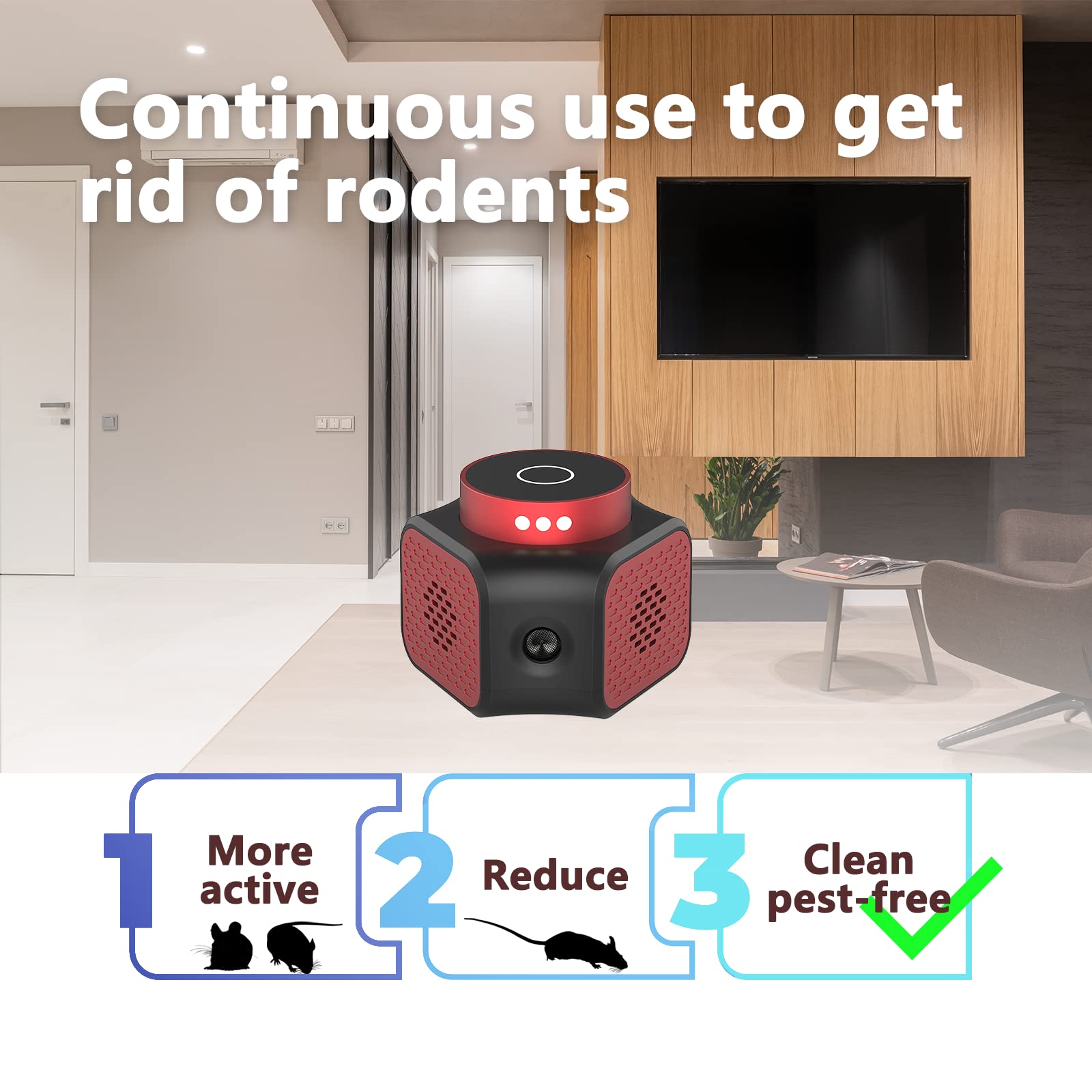 • Keeps Noise Changing - The plug-in mice repellent varies the sounds to prevent rodents from growing accustomed to high-frequency noise, continuously creating an unfriendly environment that deters and discourages rat & mice infestations