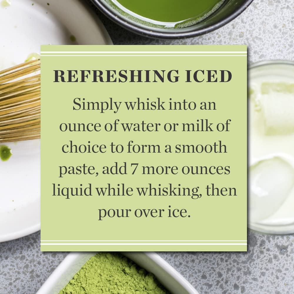 Steeping Suggestion: Whisk our matcha powder and 1 ounce of liquid into smooth paste then add 7 ounces of liquid while whisking to a smooth, frothy texture