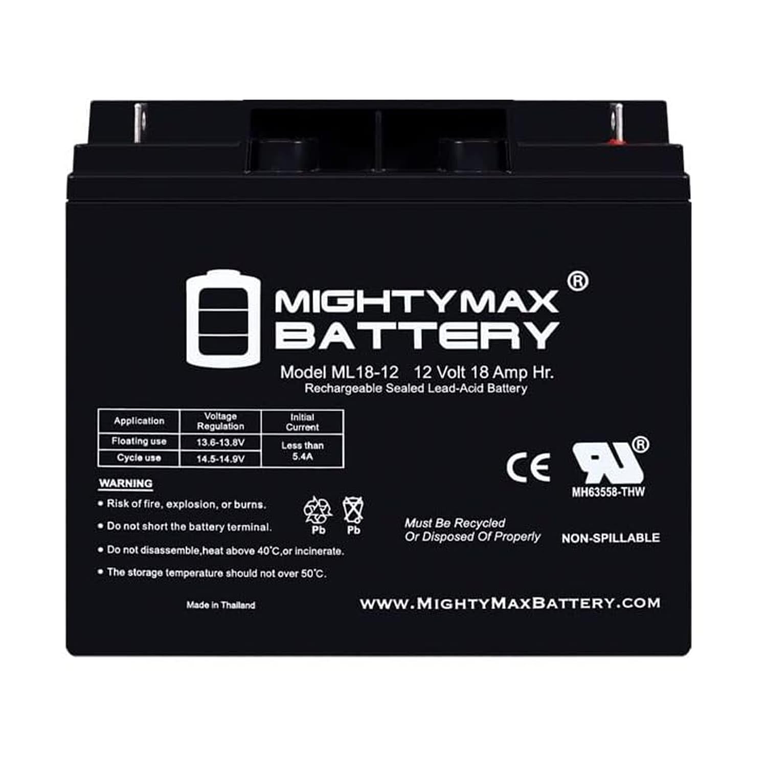 Details: Delivering power when you need it the mighty max ML18-12 12 volt 18 Ah uses a state of the art heavy-duty calcium-alloy grid that provides exceptional performance and service life in both float and cyclic applications The ML18-12 is an absorbent glass mat (AGM) technology with a valve regulated design that can be used in enclosed and indoor environments without leaking or maintenance providing a superior performance for thousands of models Mighty max sla batteries are utilized in a wide variety of applications including consumer electronics electric vehicles engine starters golf carts hunting lawn and garden tools medical mobility motorcycles power sports portable tools solar toys and hobby access control devices emergency lighting security and more