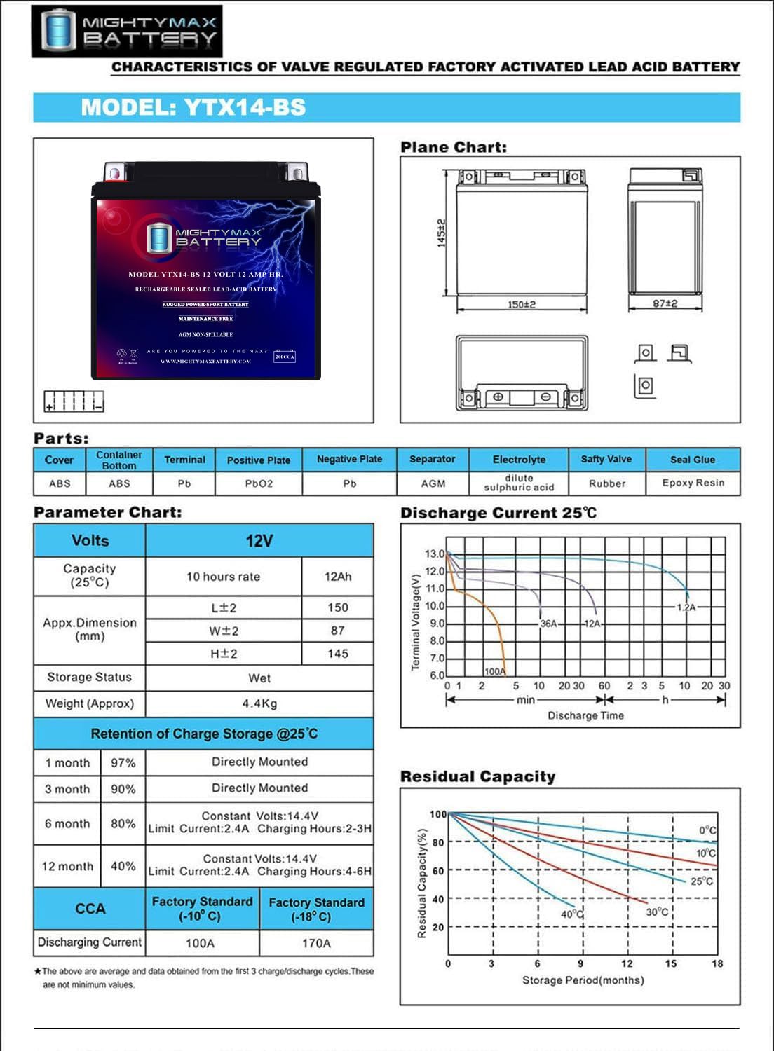 • YTX14-BS is a 12V 12AH 200 Cold Cranking Amps (CCA) Sealed Lead Acid (SLA) Battery