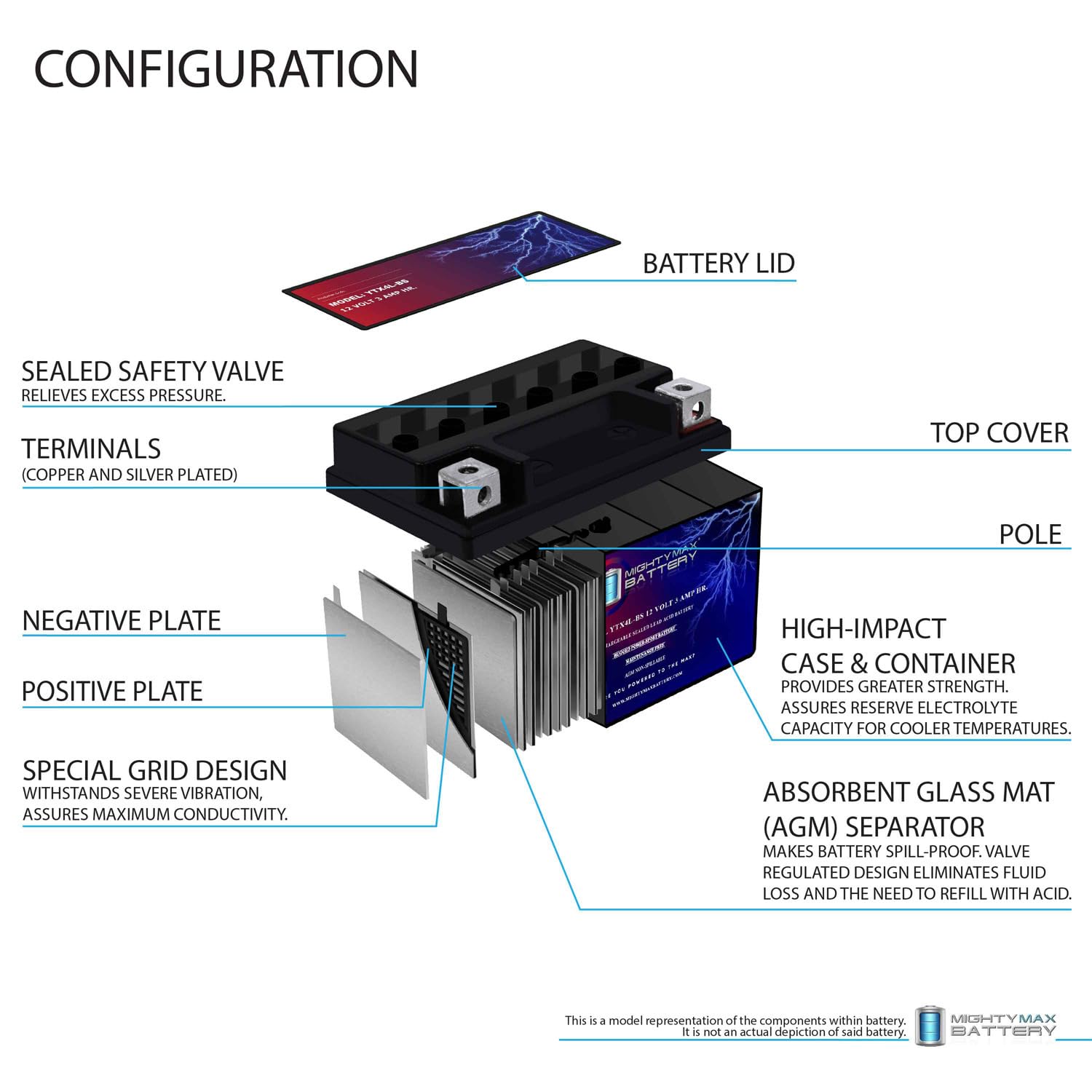 • YTX4L-BS is a 12V 3AH 50 Cold Cranking Amps (CCA) Sealed Lead Acid (SLA) Battery