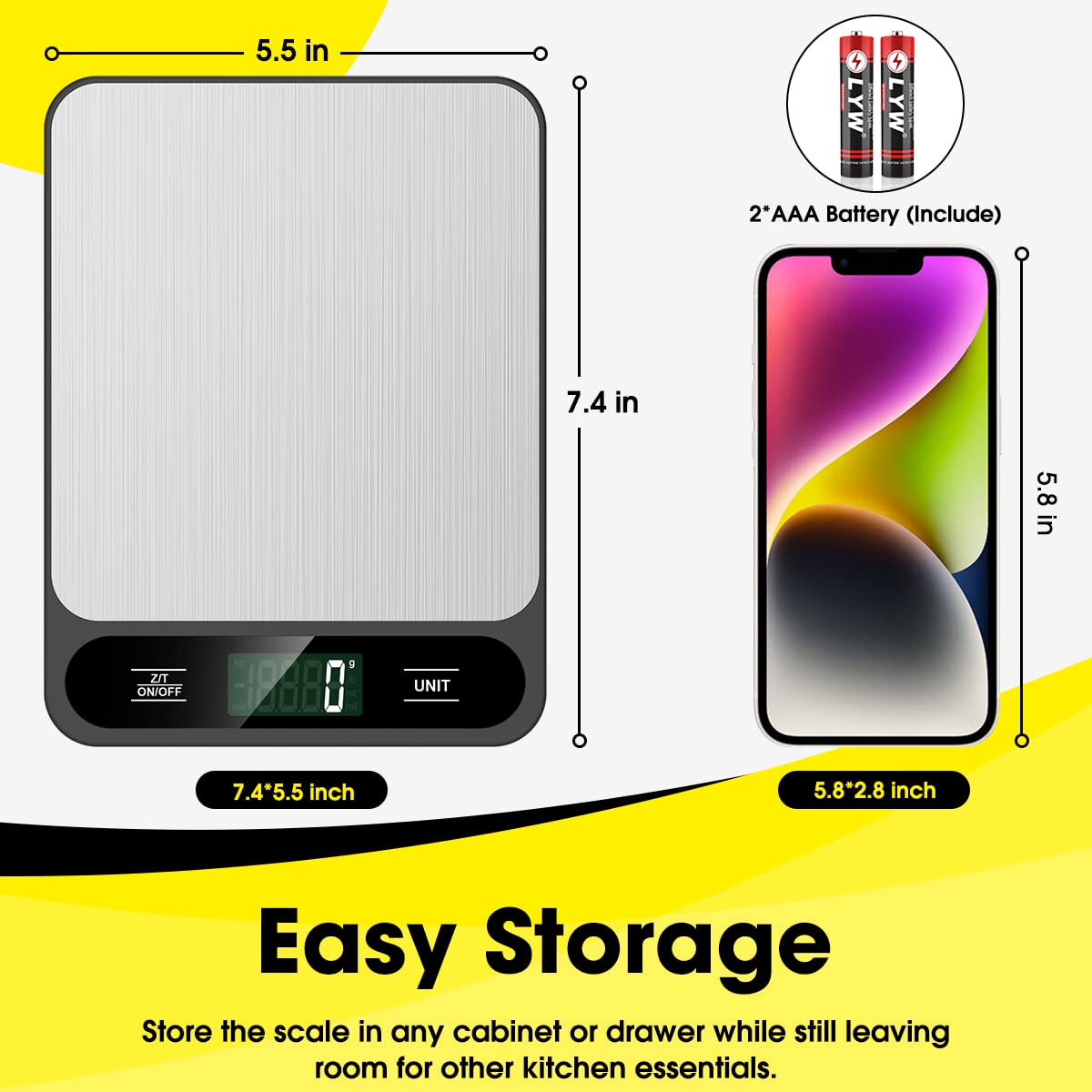 • 【Portable Design】- Small Scale Dimensions:7.4 x 5.5 x 0.6 inches. The digital kitchen scale’s convenient size makes it easy to store in your kitchen.