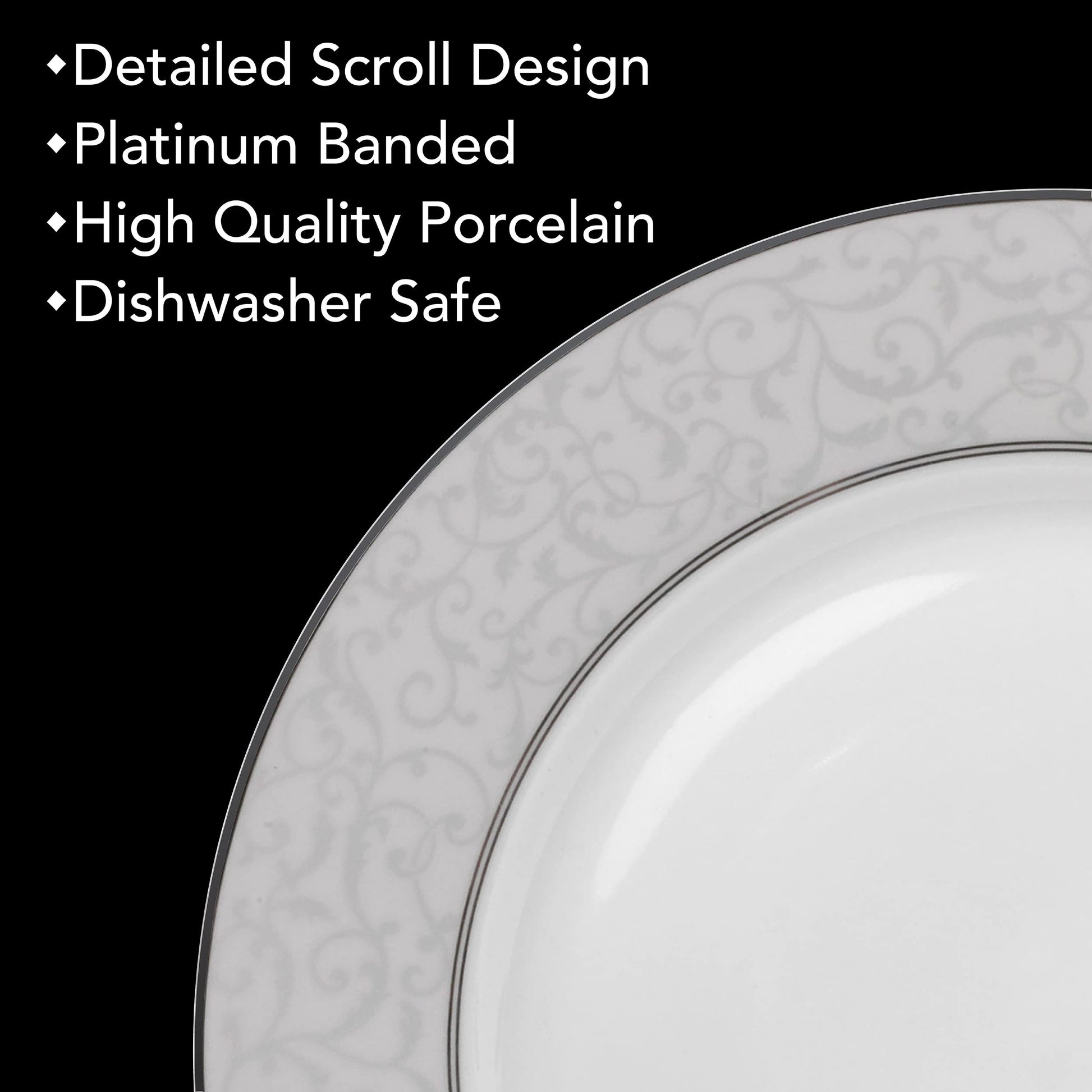 • VERSATILE DESIGN: the beautifully detailed design complements any decor and can be used for formal and casual occasions. Each piece is chic and elegant, accented by inner and outer borders of Platinum.