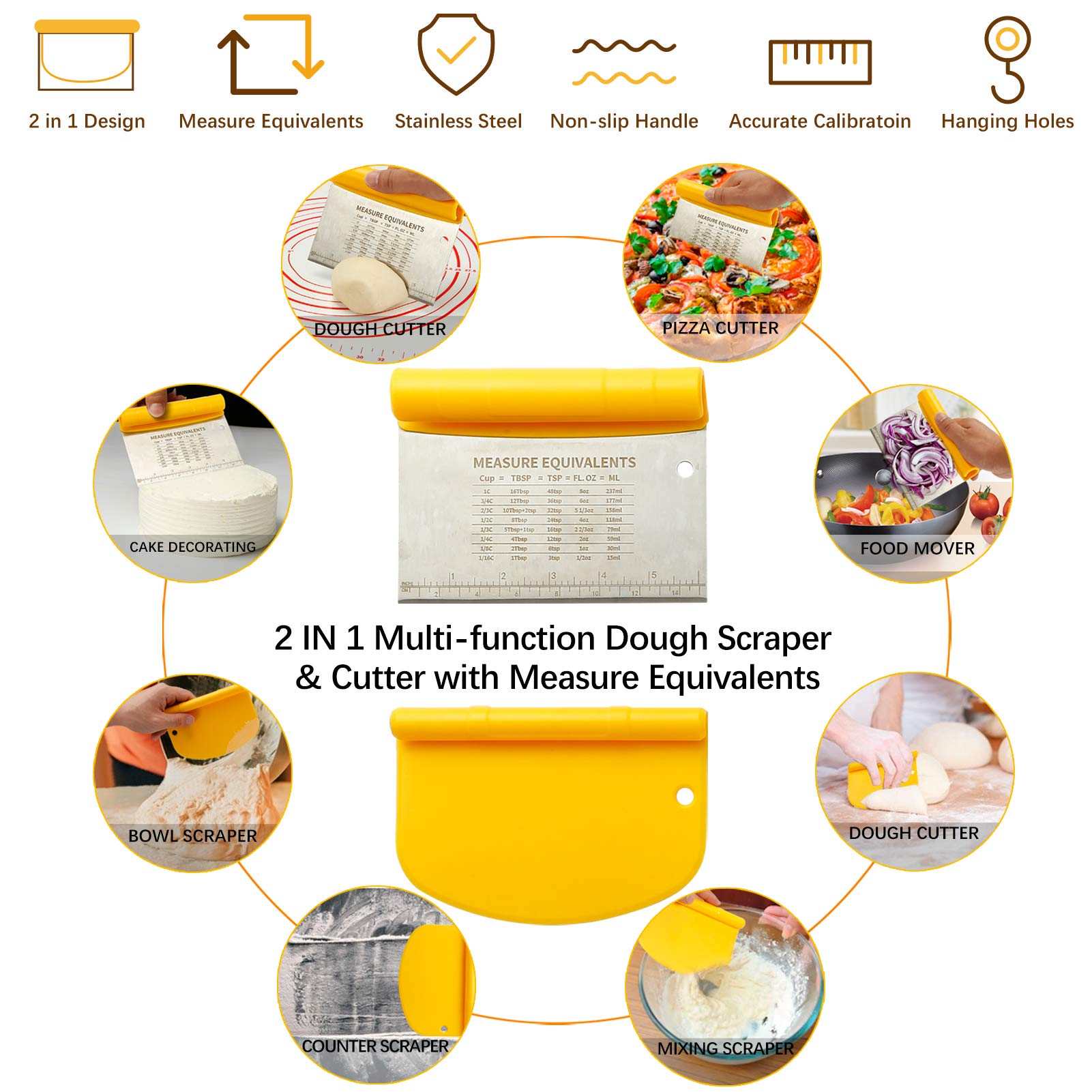 • 2 IN 1 Dough Scraper & Pizza Cutter Set: The baking tool set is multifunction, such as dough scraper, cake server, pizza cutter, food remover, dough cutter / chopper, etc. Clean kitchen counters of crumbs and dried dough. Smooth out frosting/cream on cakes, divvy up butter and much more, and Use cake scrapers to create your own unique cake shape ! All of them has a hole so you can hang them within easy reach.