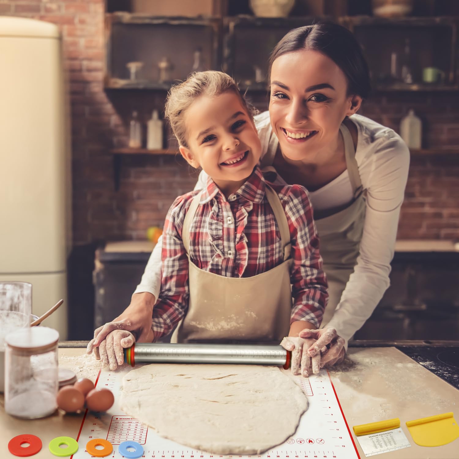 MIKULA Rolling Pin, Rolling Pins Thickness Rings and Silicone Baking Pastry Mat Set, Stainless Steel Dough Roller Rolling Pins for Baking & Bench Scraper For Pizza, Cookies, Pie, Pasta, Pastries
