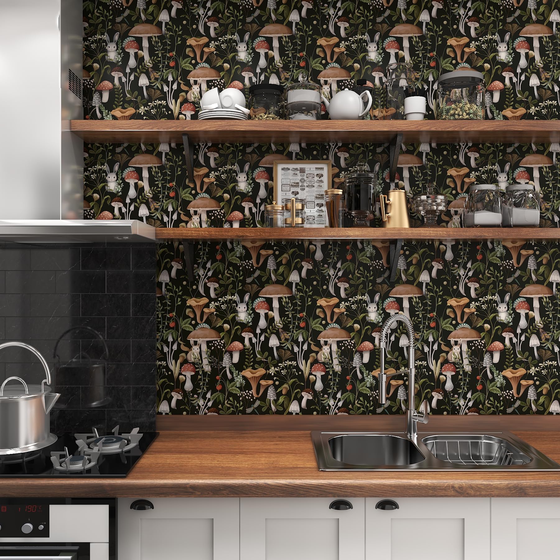 • EXQUISITE PATTERNS:Black serves as the background color, and green leaves, white rabbits, flowers, caterpillars, and various mushroom patterns are combined to decorate your room, giving a dark forest visual experience and creating an overall elegant atmosphere. The size of this mushroom contact paper is 17.7 'x 393' rolls (48.4 square feet per roll) inches