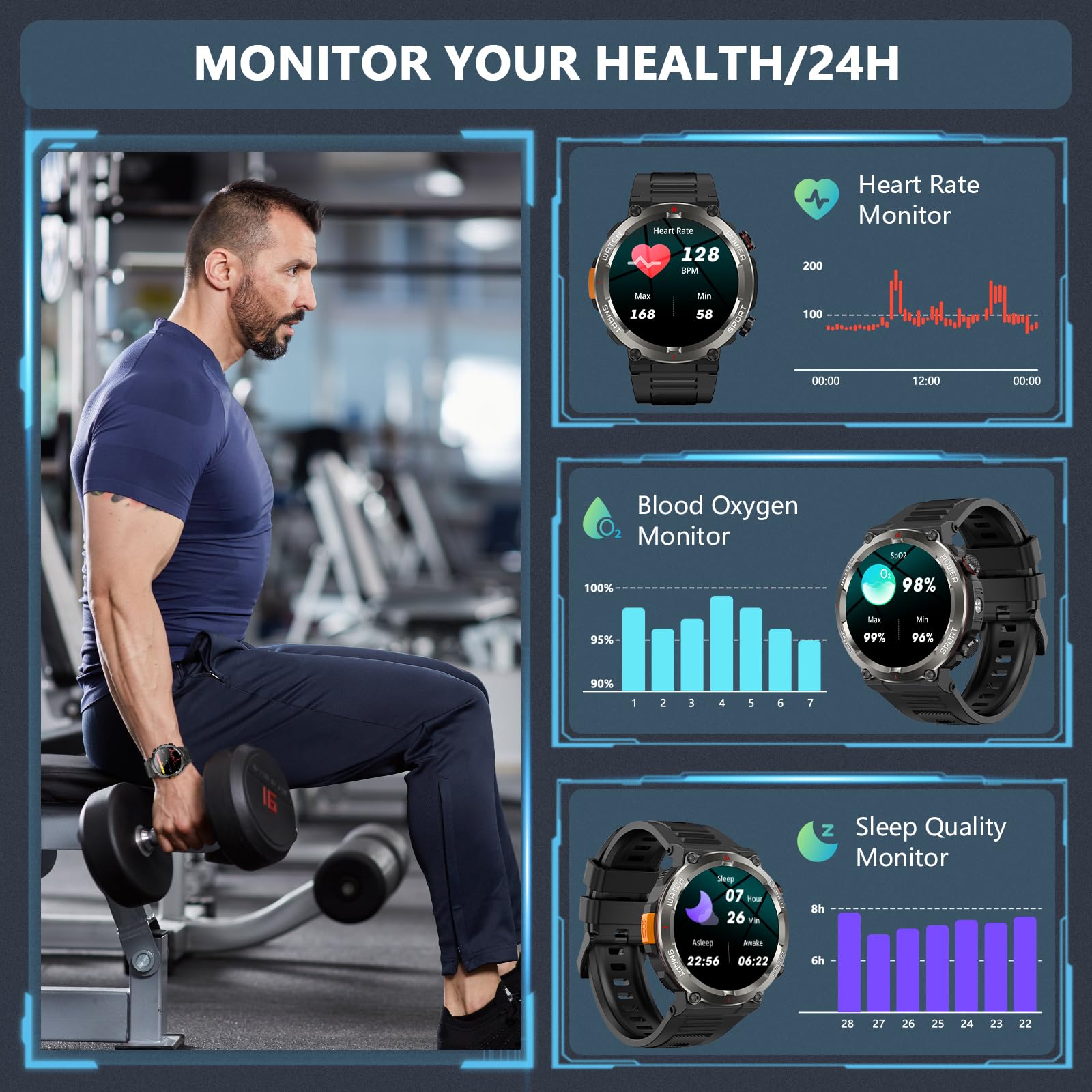 • 【24H Health Monitoring】The health smartwatch is equipped with a third-generation high-precision sensor chip and a live monitoring module. When you wear the smartwatch, it will automatically measure your dynamic/static heart rate and blood oxygen. The sleep monitor can monitor your sleep quality and provide data on light sleep, deep sleep, and awake time. (*NOTE: This watch cannot be used as a medical diagnostic device.)