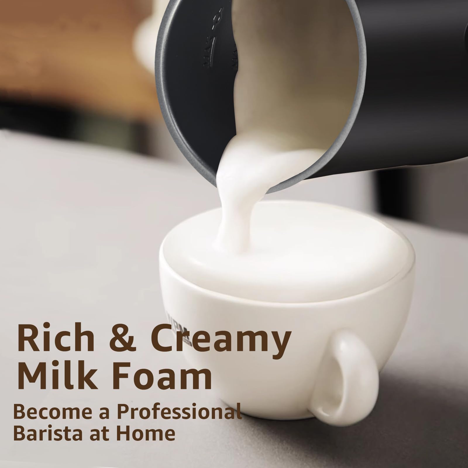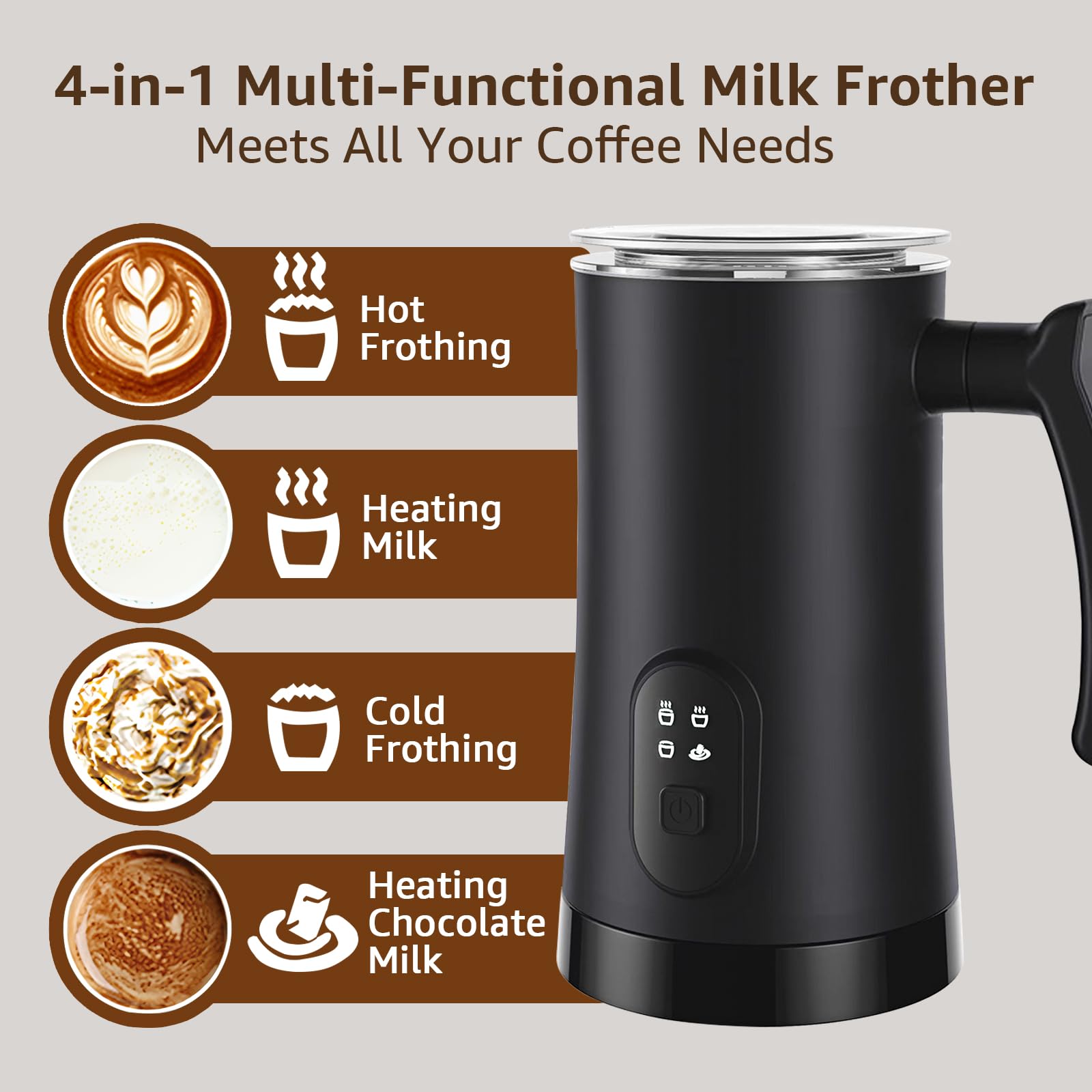 • 4-in-1 Multifunctional Design: Whether you're a coffee novice or an experienced barista, you can easily use our milk frother to heat up milk, create dense hot foam, cold foam, or delicious hot chocolate milk all with one button. Enjoy the perfect blend of coffee and milk at home