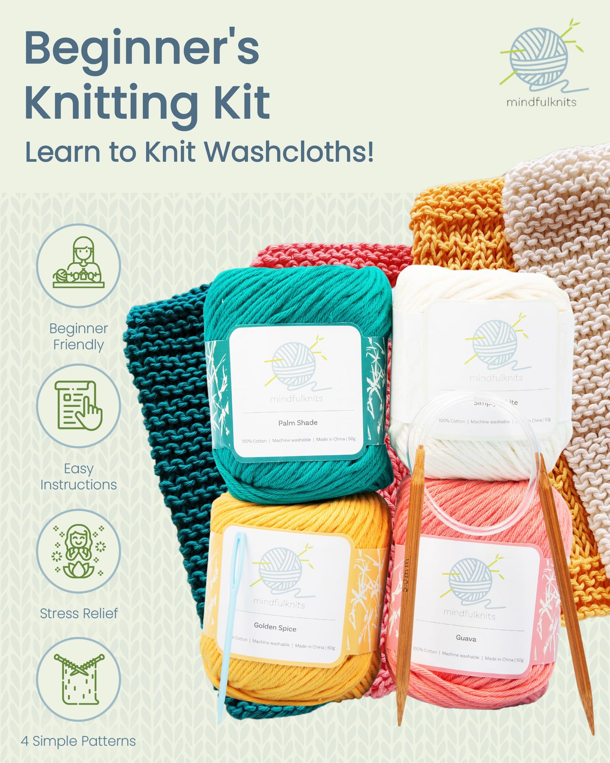 mindfulknits Knitting Starter Kit for Beginners with Knitting Needles, Yarn Needle & 100% Cotton Knitting Yarn (4) – Make Washcloths- Tropical Knitting Kit for Kids Relaxation & Stress Relief