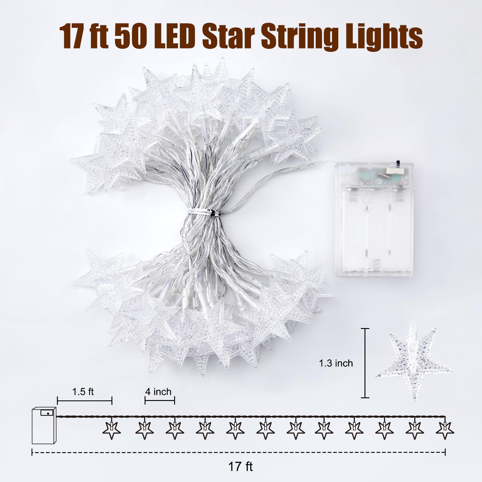 • 【 Battery Star String Lights 】- Powered by 3 × AA batteries ( not included ), the star fairy string lights are 17 feet long with 50 bright LEDs. The thin clear wiring and lovey star-shaped LED bulbs will add a delicate and romantic touch to your personal space. Each star bulb is about 1.3 inches wide with durable, waterproof plastic construction