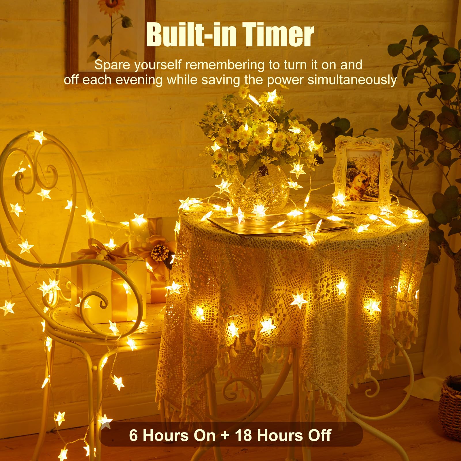 Minetom Star String Lights Battery Operated - 17 ft 50 LED Star Fairy String Lights with Timer, Waterproof for Indoor Bedroom Tent Loft Bed Patio Party Wedding Decor, Warm White