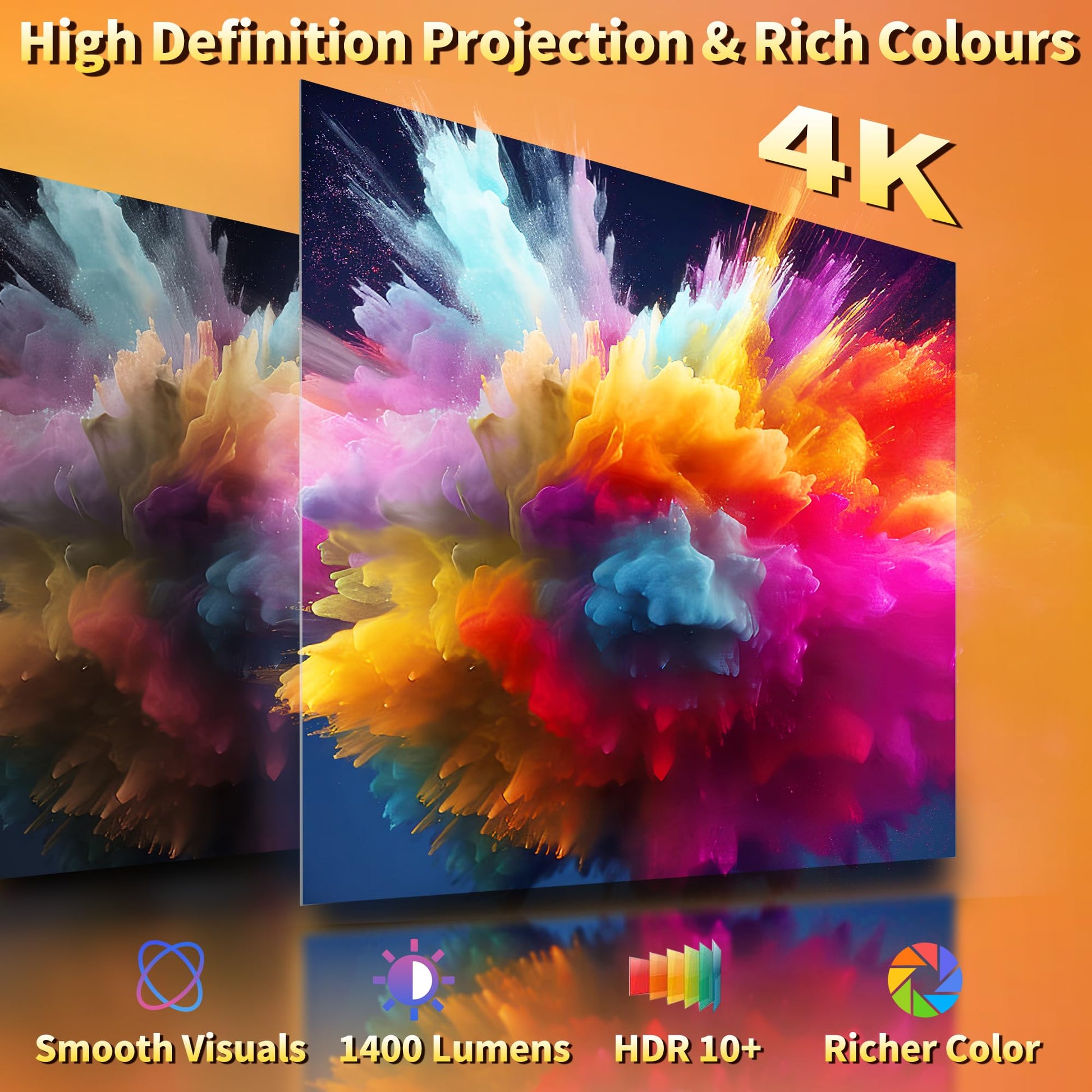 • 【High-Definition Video with 4K Compatibility】Featuring a 1920x1080 Full HD resolution and the ability to decode 4K Ultra HD videos, this portable projector employs advanced LED technology offering 1400 lumens and a contrast ratio of 10000:1. Whether enjoying films, TV series, or gaming, it provides an engaging visual spectacle, transforming your home into a cinema.