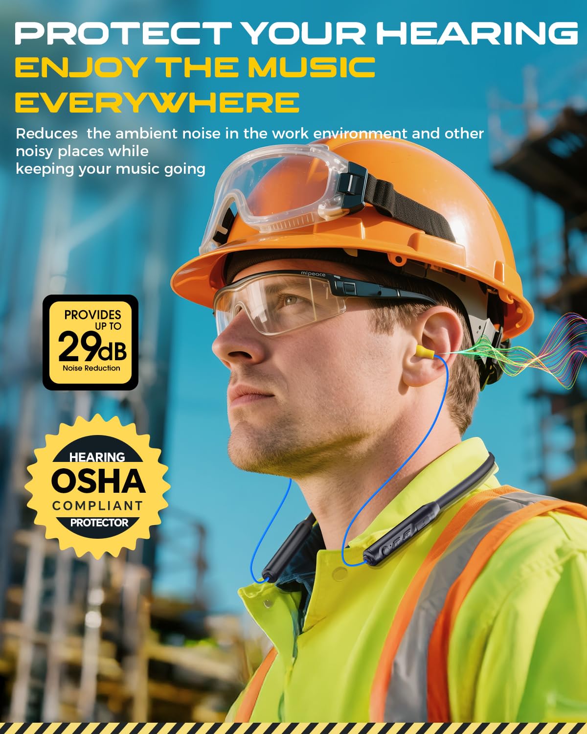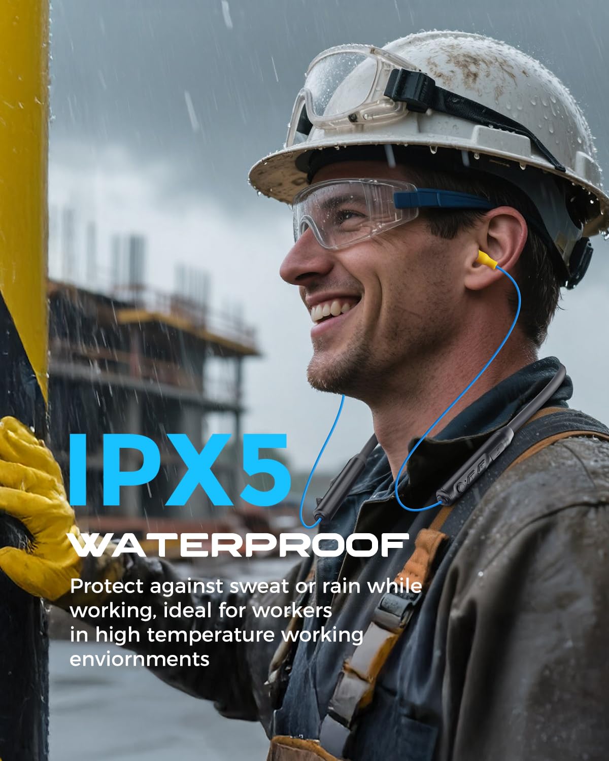 • Ergonomic Lightweight Neckband Design: Designed for comfort, these neckband headphones weigh just 30g and feature flexible joints for a pressure-free fit. The hidden earbuds for work design ensures all-day comfort, making them ideal for long shifts. Whether you're on-site or at the gym, these safety ear plugs with bluetooth are built for durability and ease of use.