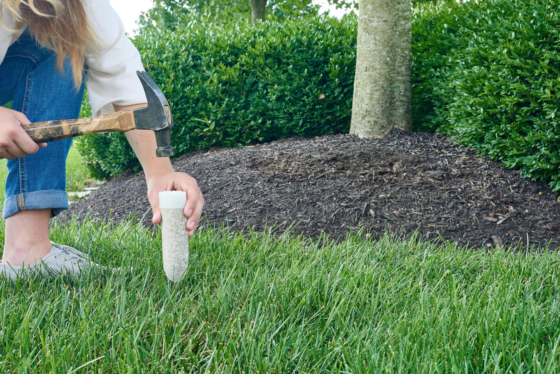 • To apply plant food spikes, place enclosed plastic cap on top of the spike and drive it into the ground around tree or shrub; remove plastic cap and continue to drive spike 2 inches below the surface