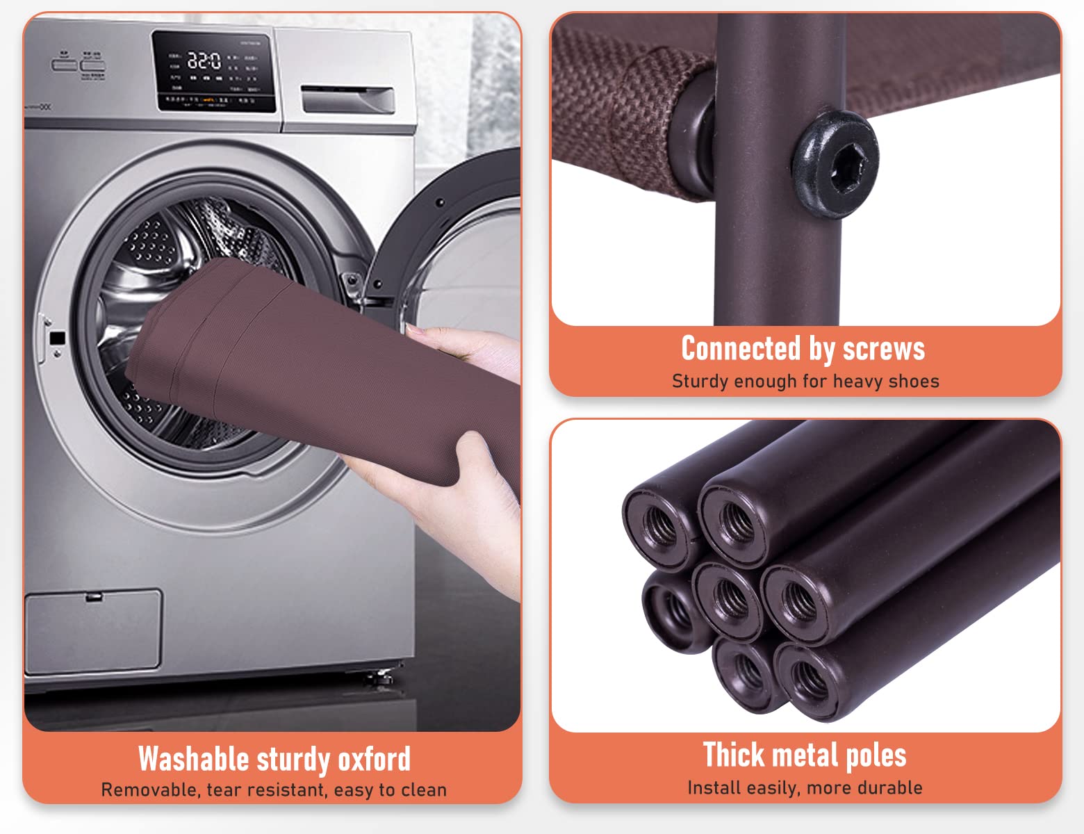 • 【All-metal pieces + oxford fabric to ensure durability】The closet shoe rack floor is sturdy and will last a long time; Thick main frames won't damaged and rusted; Washable thick oxford is as sturdy as canvas and your shoes won't slide off rack;