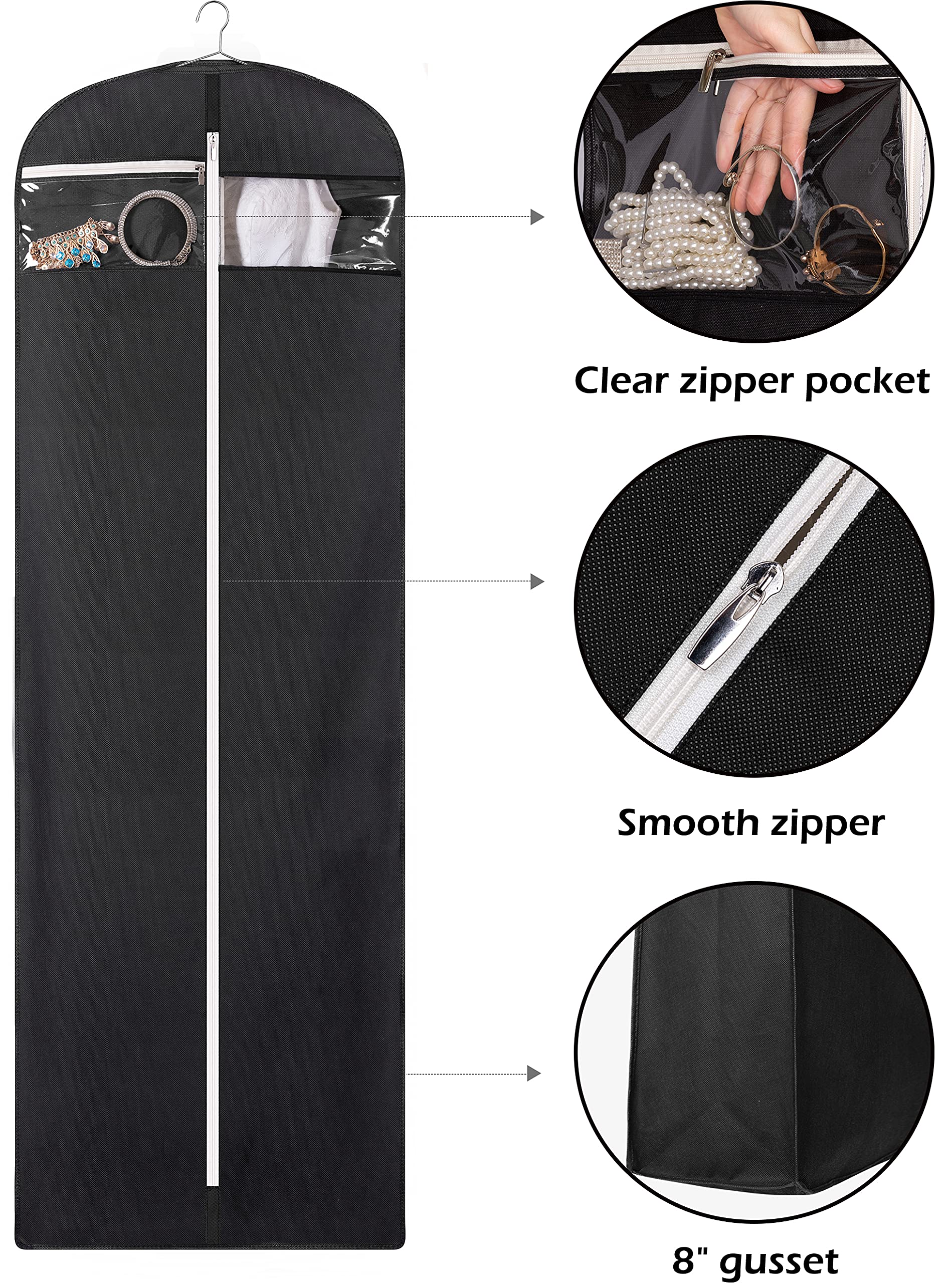• A zipper pocket for holds jewelry accessories, wedding veil,collar and pins ect, clear pvc window to view in without having to unzip the whole bridal gown garment bag;