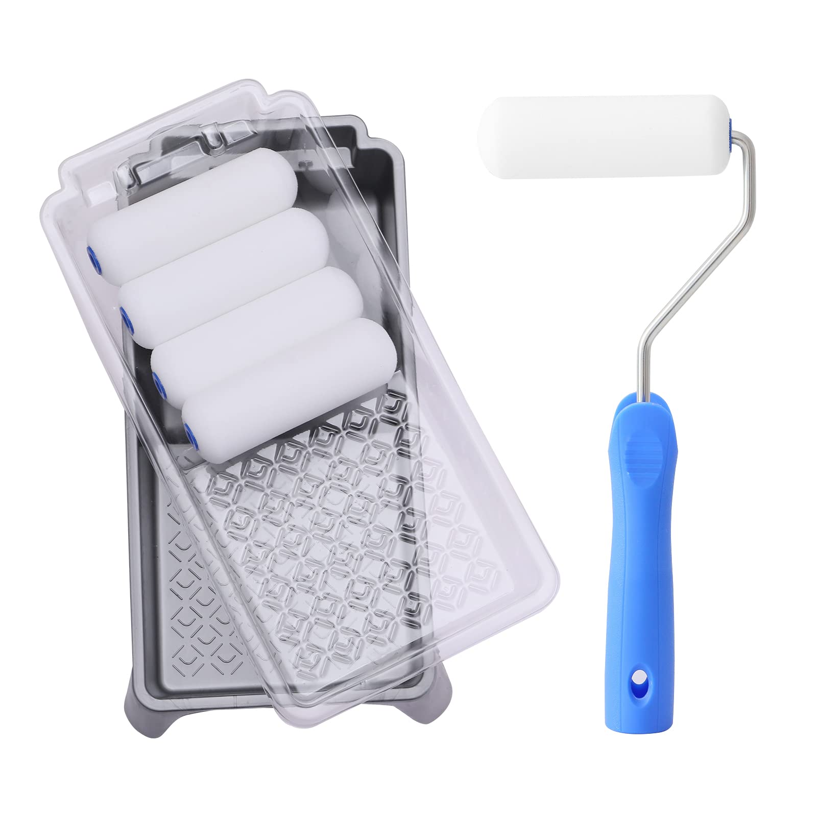 • Small Paint Roller Kit: Includes 4 inch foam paint roller 5 covers, 1 roller frame, 1 plastic paint tray, 1 tray liner, a complete set for your painting projects