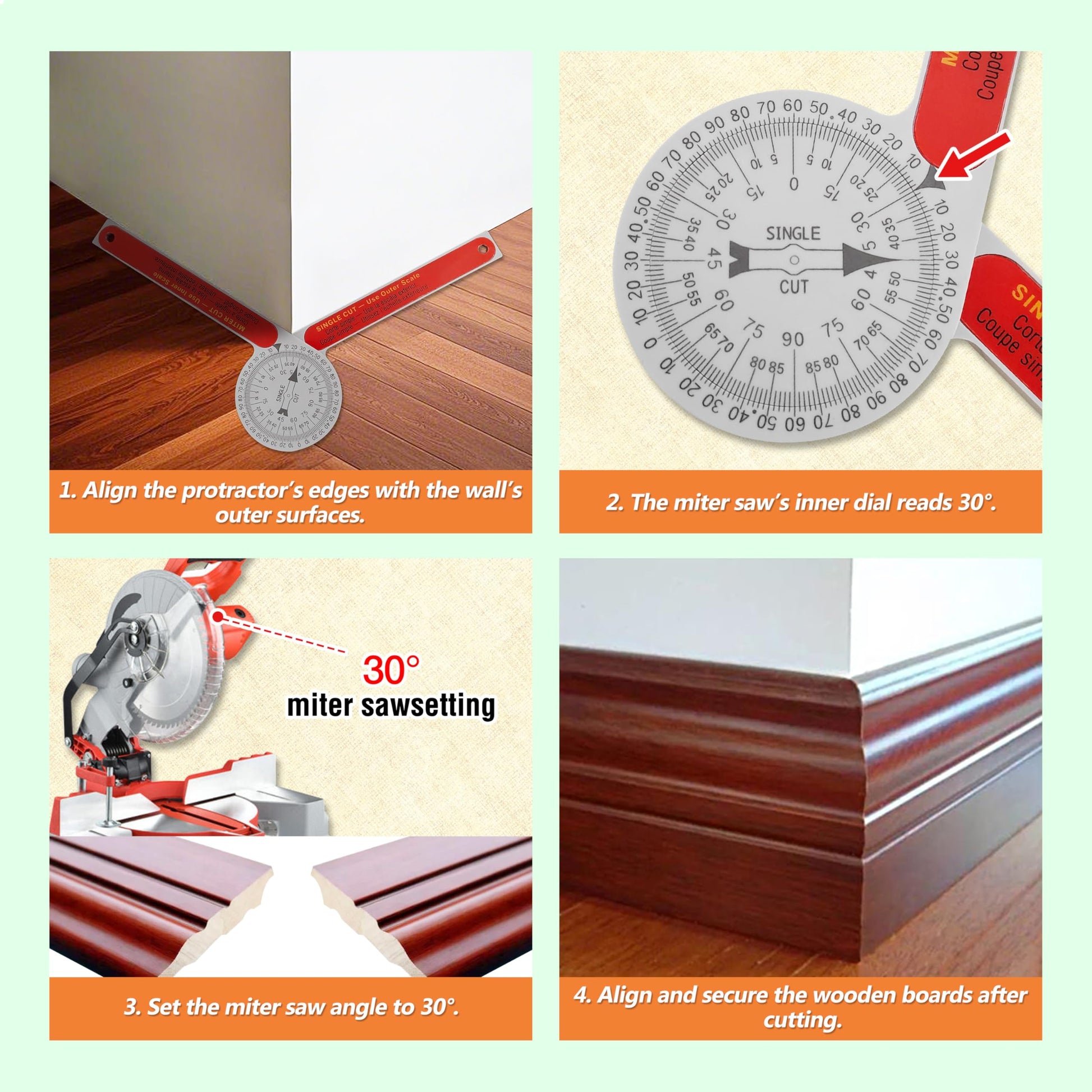 • EASY TO USE: Without tough calculations. Arm rotates a full 360 °, the scale marks single cut and "miter" cut angles,help you to find the angle to cut baseboard and crown molding miters more quickly.