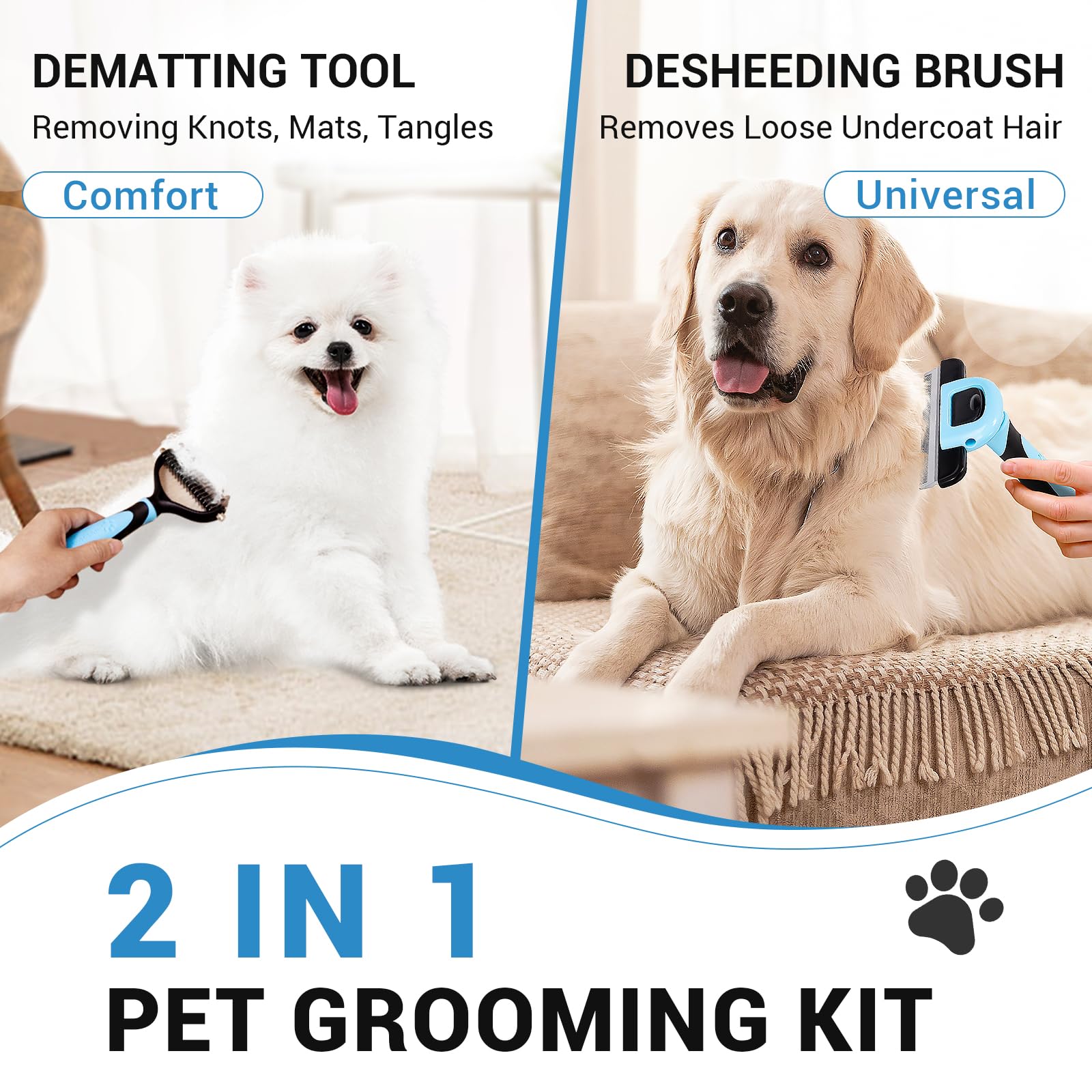 • 2 in 1 Grooming Tool: The first step undercoat rake easily brushes out tangled hair, and the second grooming brush efficiently removes loose undercoat. Just two steps to get your pet a silky smooth coat and make grooming a pleasure