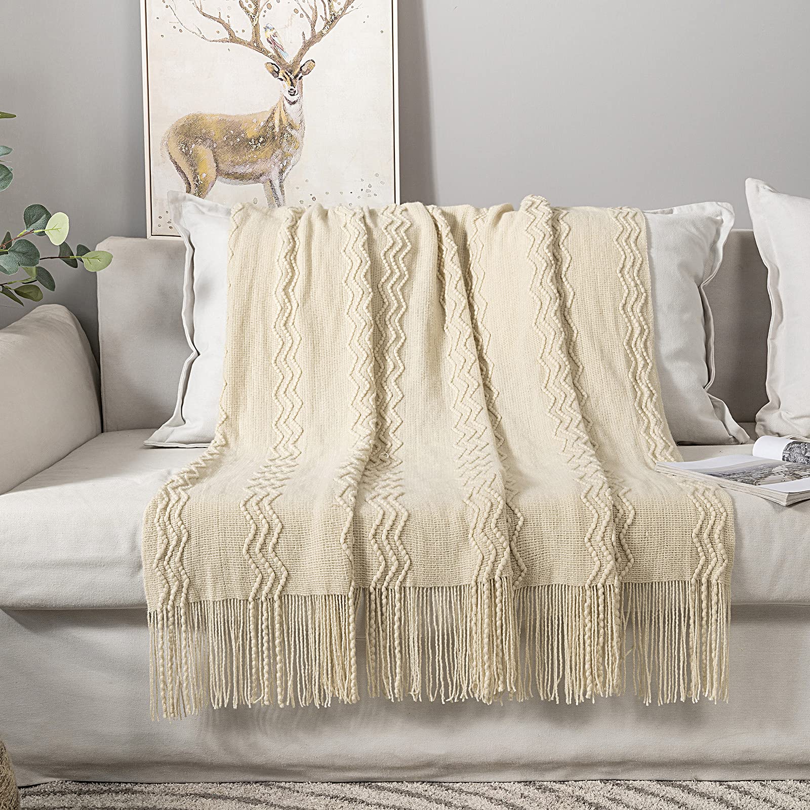MIULEE Knitted Beige Throw Blanket Soft Sofa Knit Blanket for Couch 50 x 60 Inches, Solid Cozy Lightweight Wave Pattern Decorative Blankets with Tassels for Women, Kids and Babys