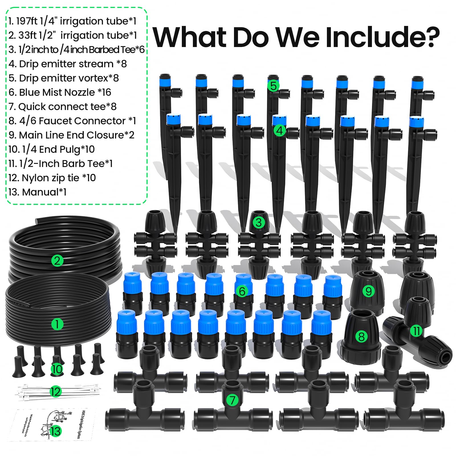 • ✔Comprehensive Drip Irrigation Kit:MIXC drip irrigation system, equipped with a versatile range of components, caters to all your garden watering needs.Includes essential parts such as 197ft 1/4'' irrigation tube, 33ft 1/2'' irrigation tube, 1/2‘’ Lock Barbed Tee connectors, drip emitter streams, vortex emitters, Blue Mist Nozzles, Quick connection tees, Faucet Connector, and more.