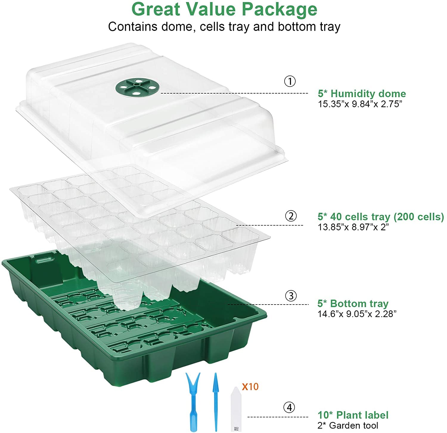 MIXC Seedling Trays Seed Starter Tray, 5-Pack Mini Propagator Plant Greenhouse Grow Kit with Humidity Vented Domes and Base for Seeds' Starting (40 Cells Per Tray, Total 200 Cells), Green